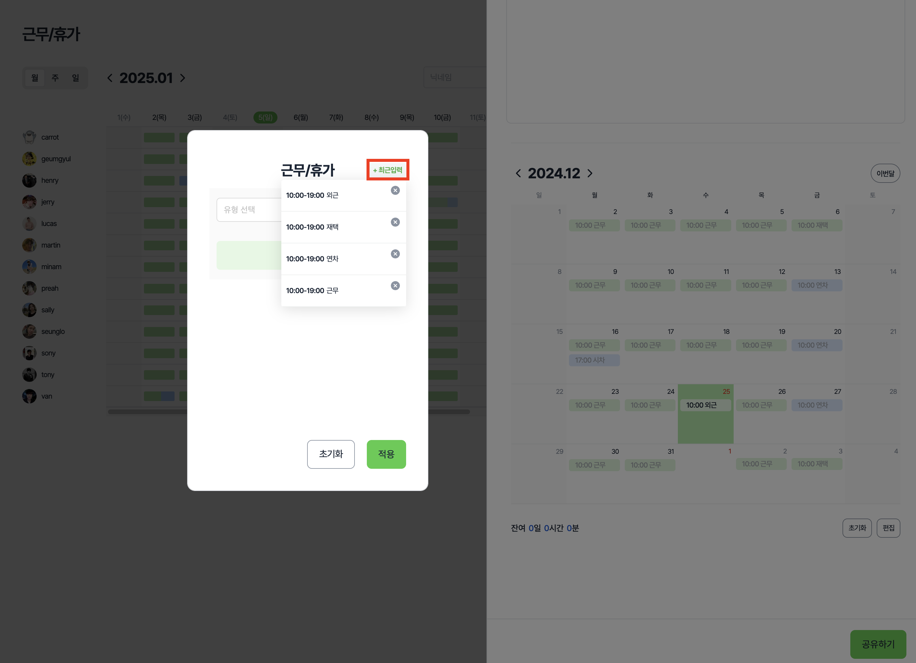 근무/휴가 등록 및 수정시 '최근 입력' 버튼을 선택하면 최근 등록한 근무/휴가 계획을 재사용할 수 있어요.
