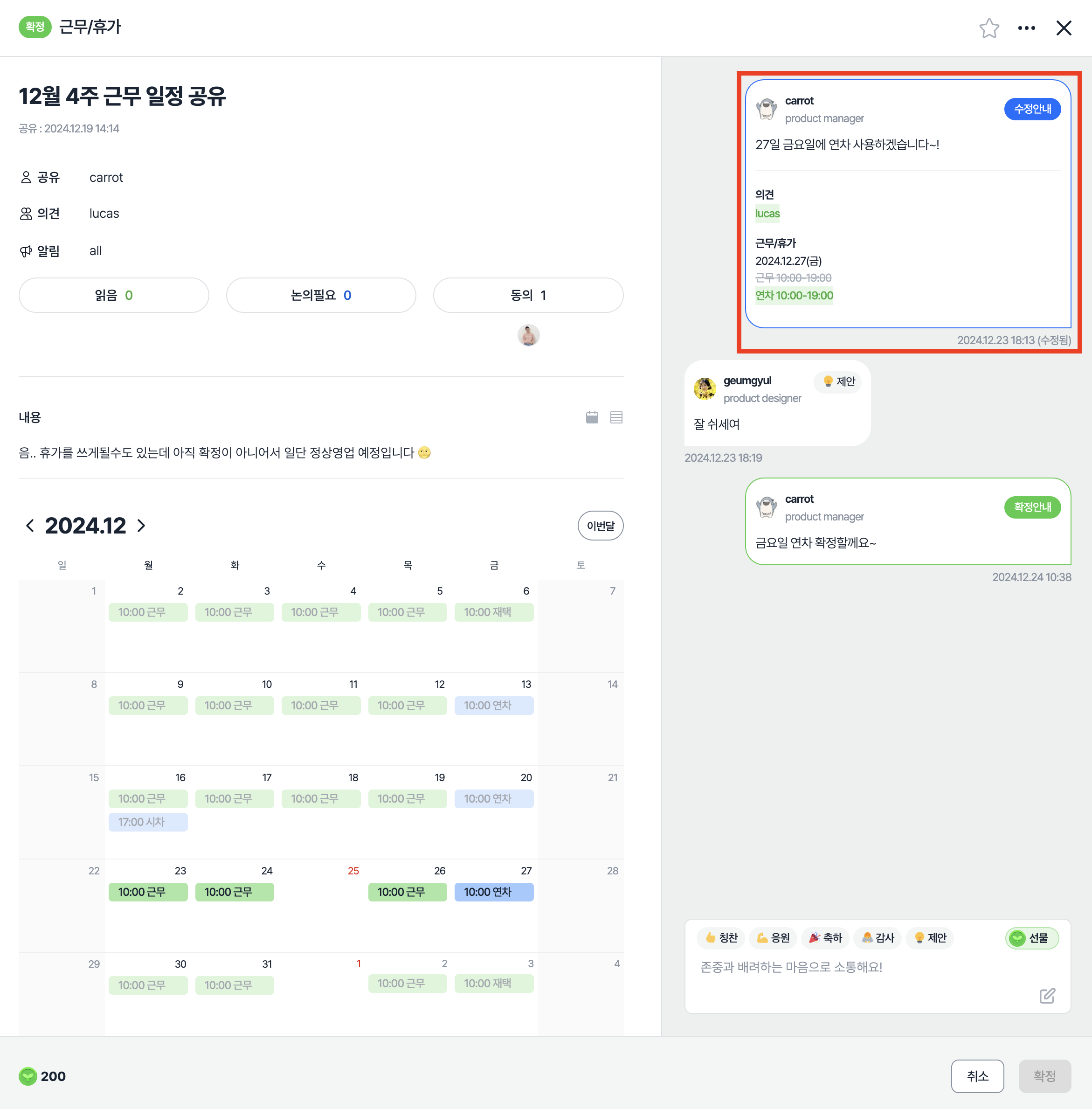 수정 사유와 함께 수정된 정보를 확인하고 빠르게 의사결정을 내릴 수 있어요.