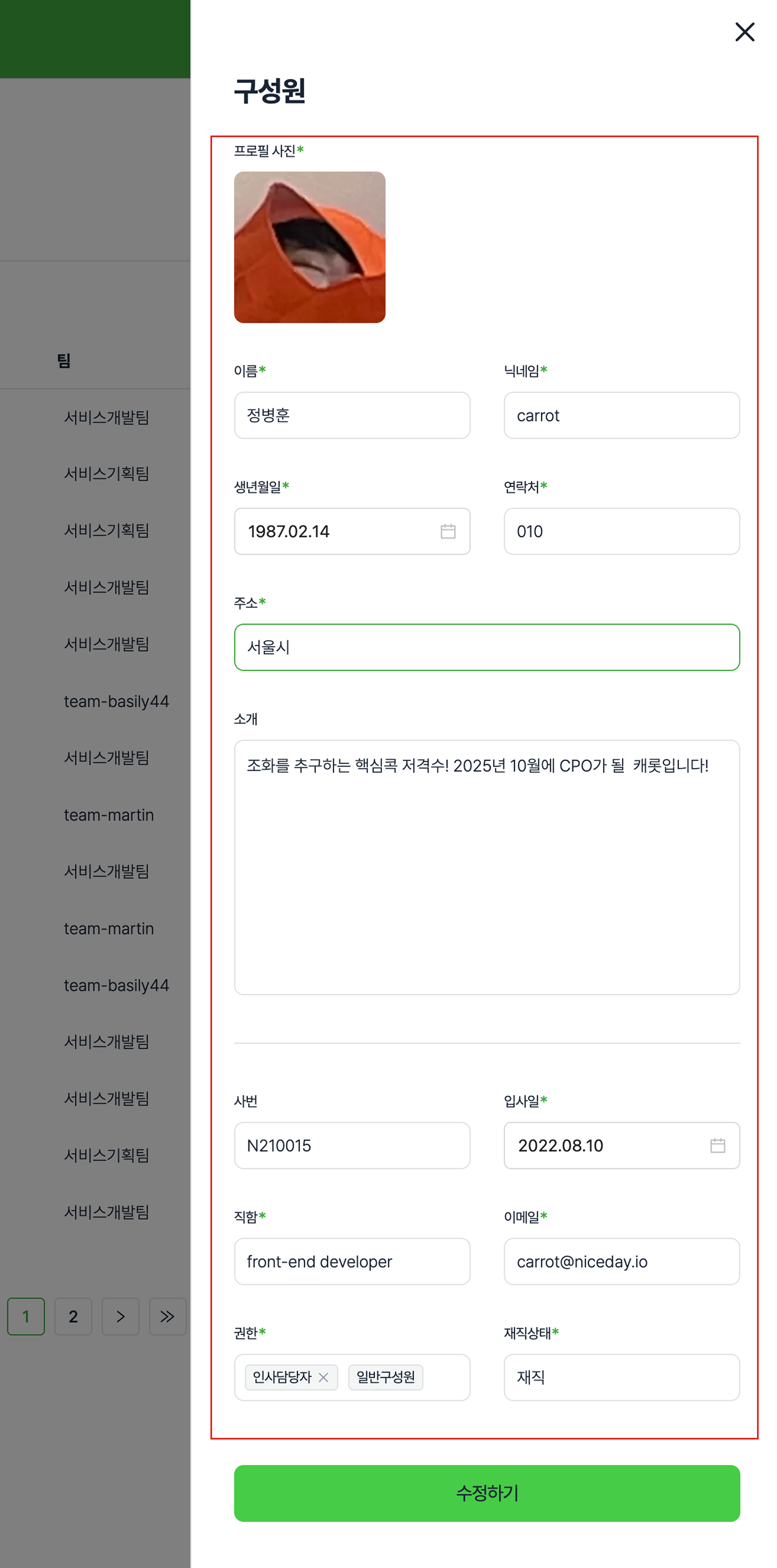 단계 3) 구성원 정보를 수정 후 [수정하기] 버튼을 클릭하면 수정이 완료됩니다.