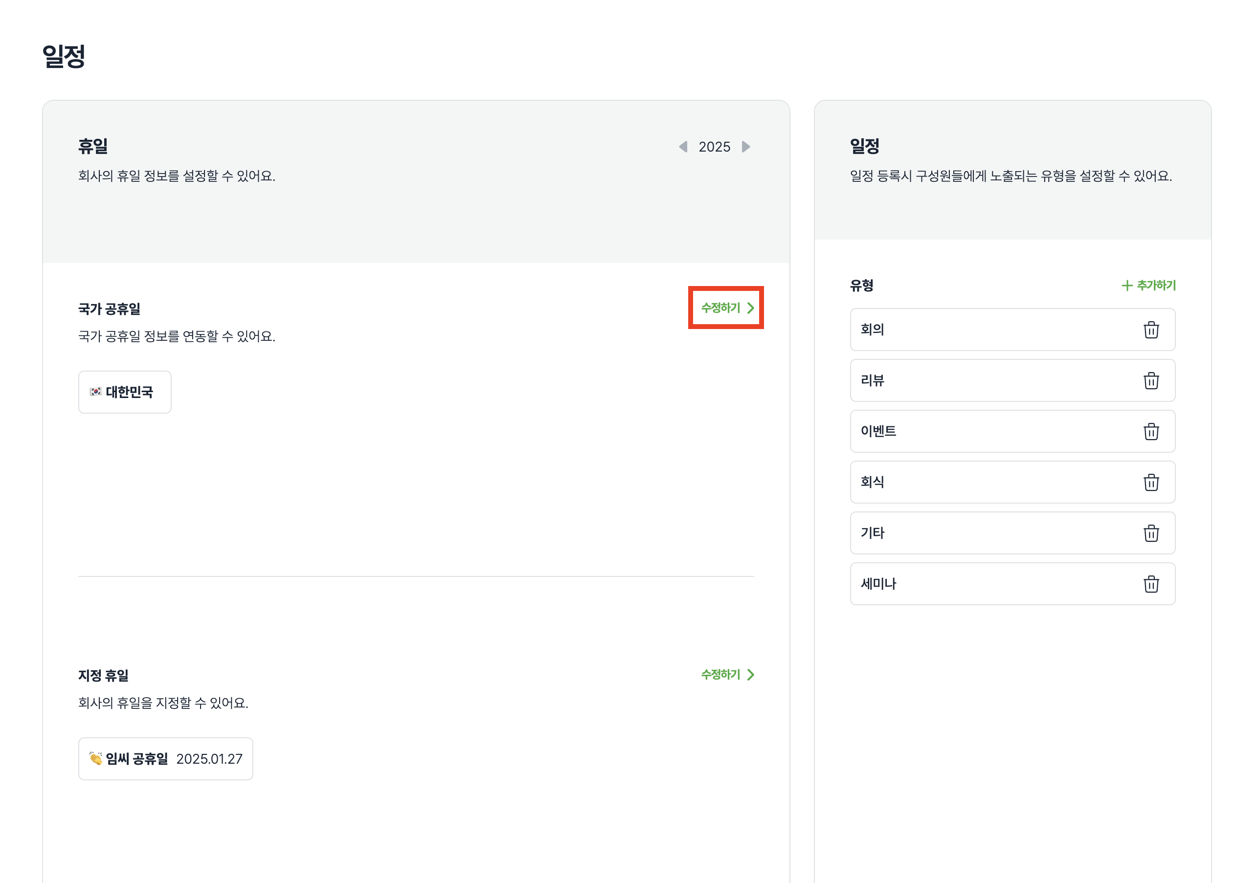 단계 1) 설정 > 공유 > 일정 메뉴에서 국가 공휴일 [수정하기] 버튼을 클릭해주세요.
