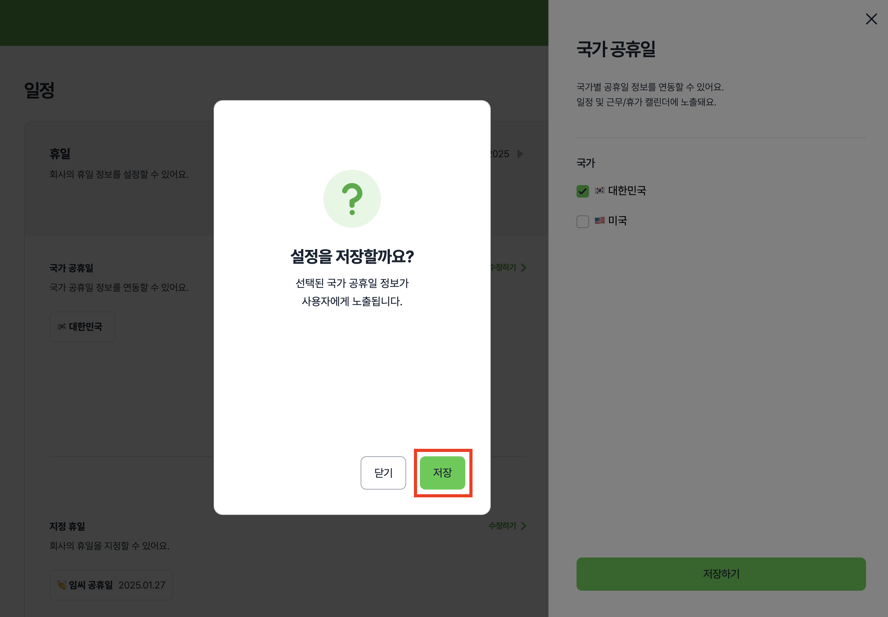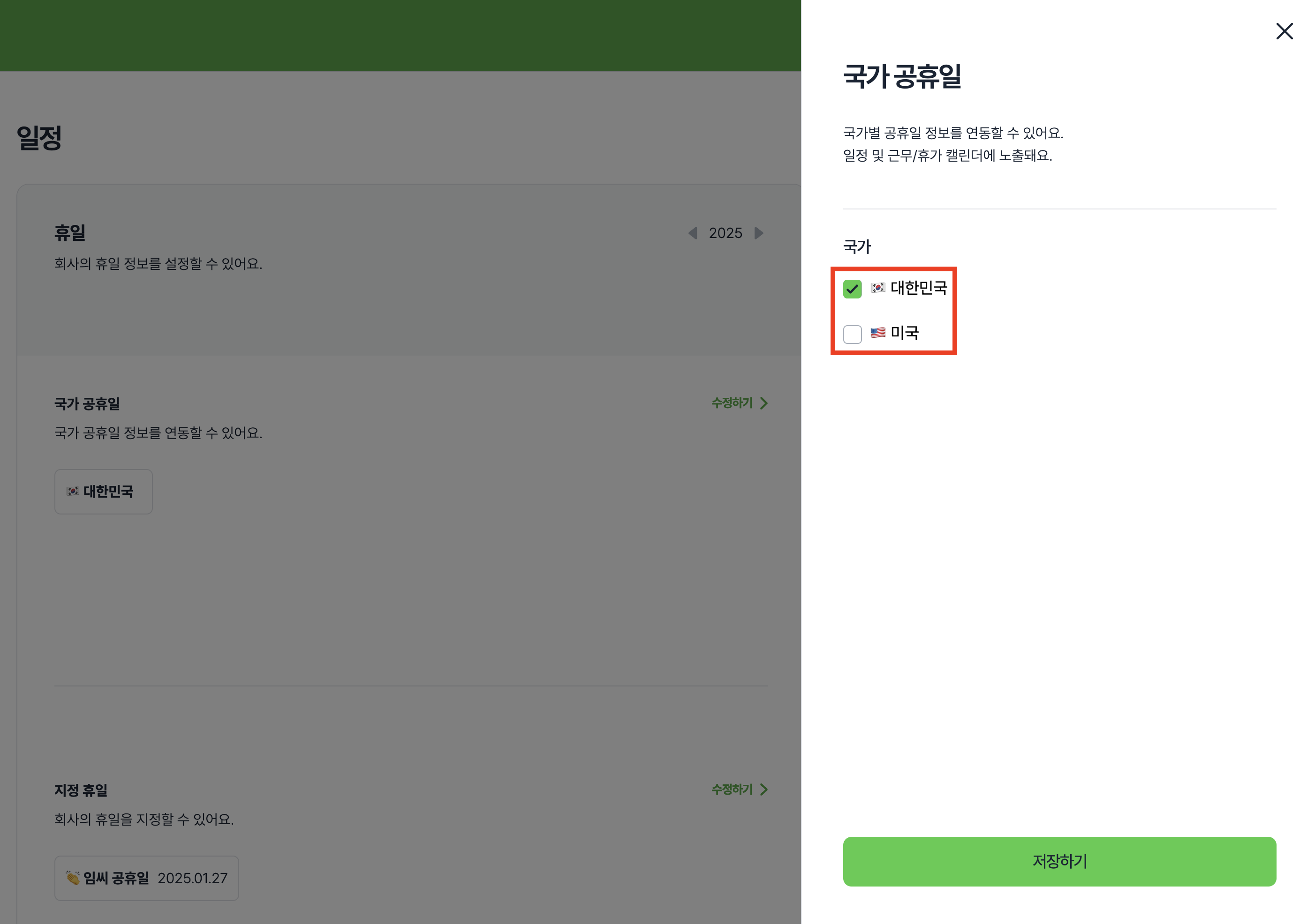 단계 2) 공휴일 정보를 연동할 국가를 체크한 후 [저장하기] 버튼을 클릭해주세요.