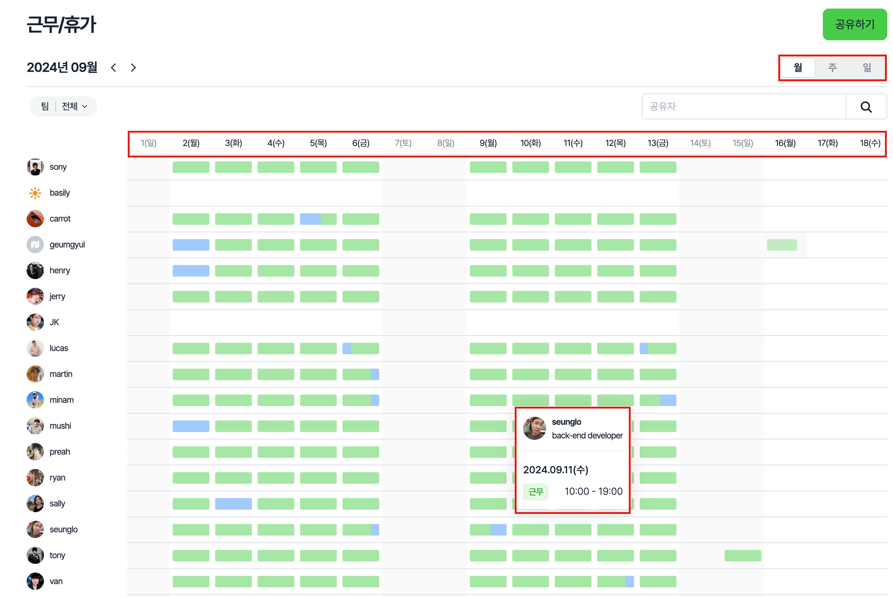 월, 주, 일 을 선택하여 원하는 기간으로 근무/휴가 상태를 조회할 수 있습니다.
