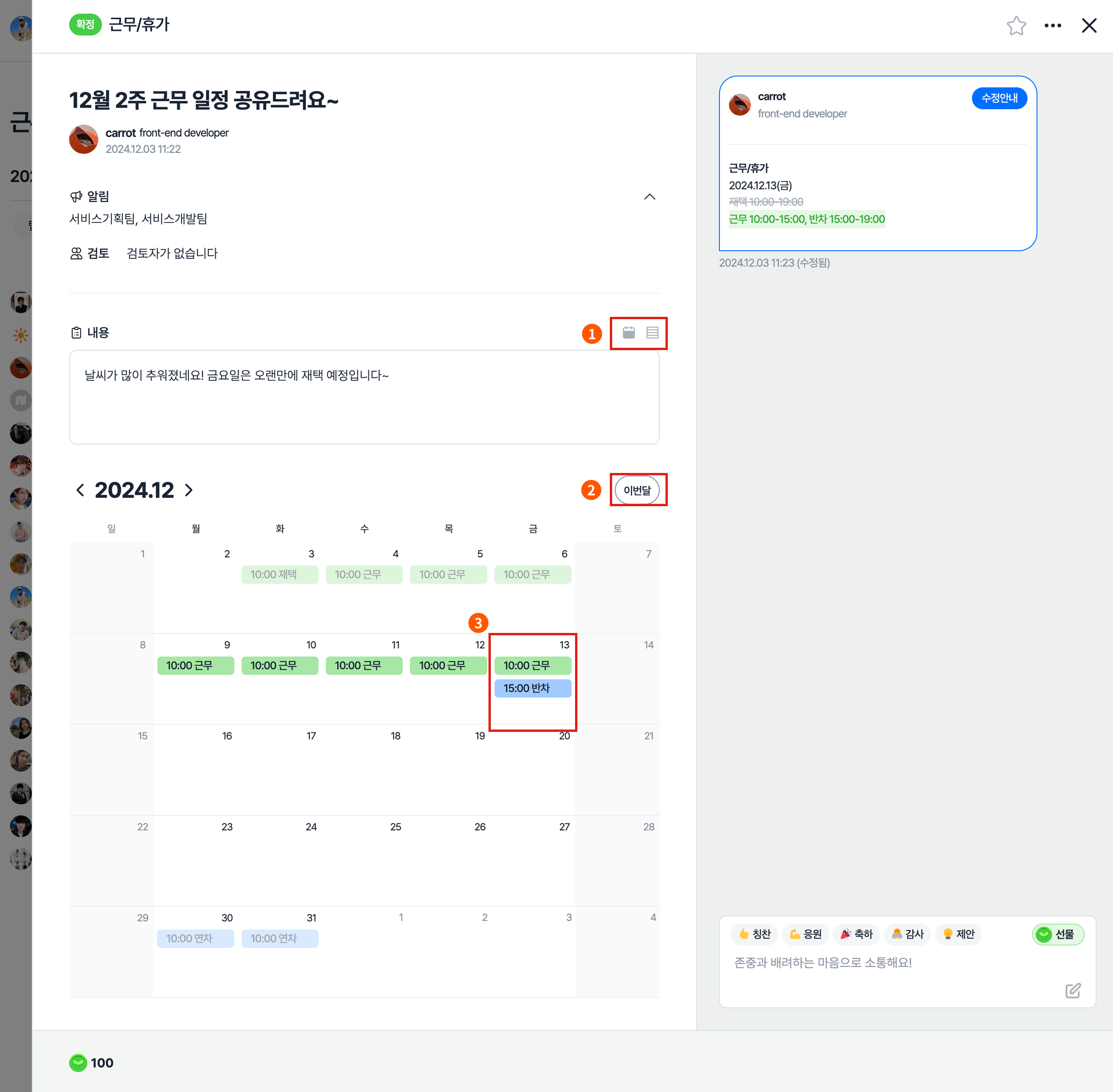 근무/휴가 계획을 캘린더뷰 또는 목록뷰로 조회할 수 있습니다.