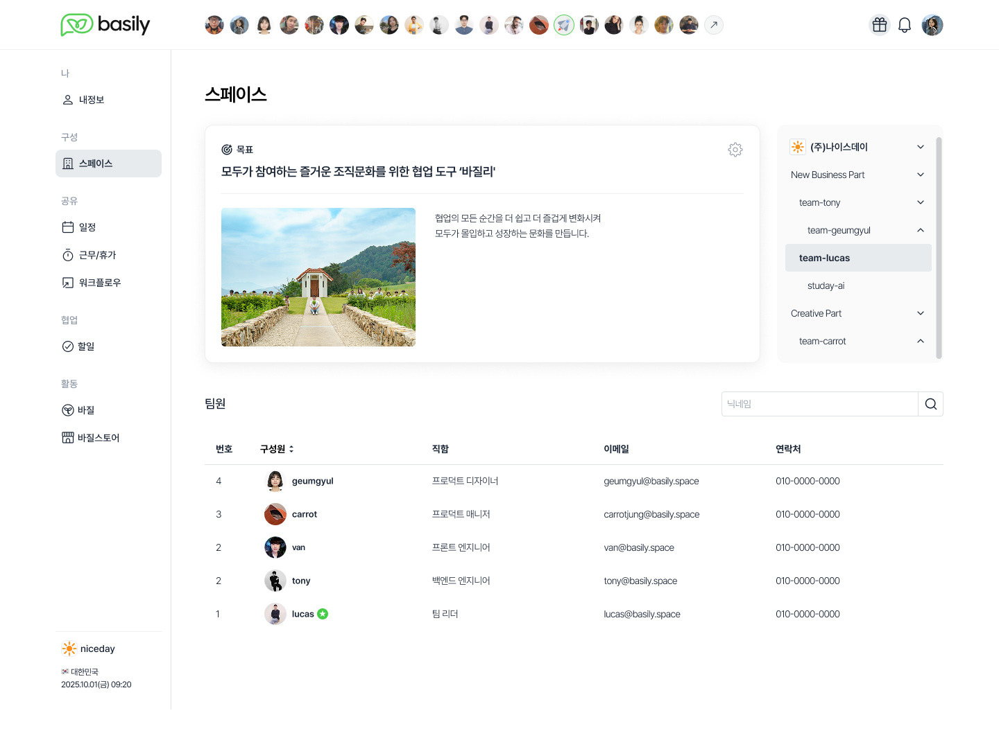 이제 ‘회사’, ‘팀’, ‘구성원’ 정보는 하나의 메뉴인 스페이스에서 확인할 수 있어요.