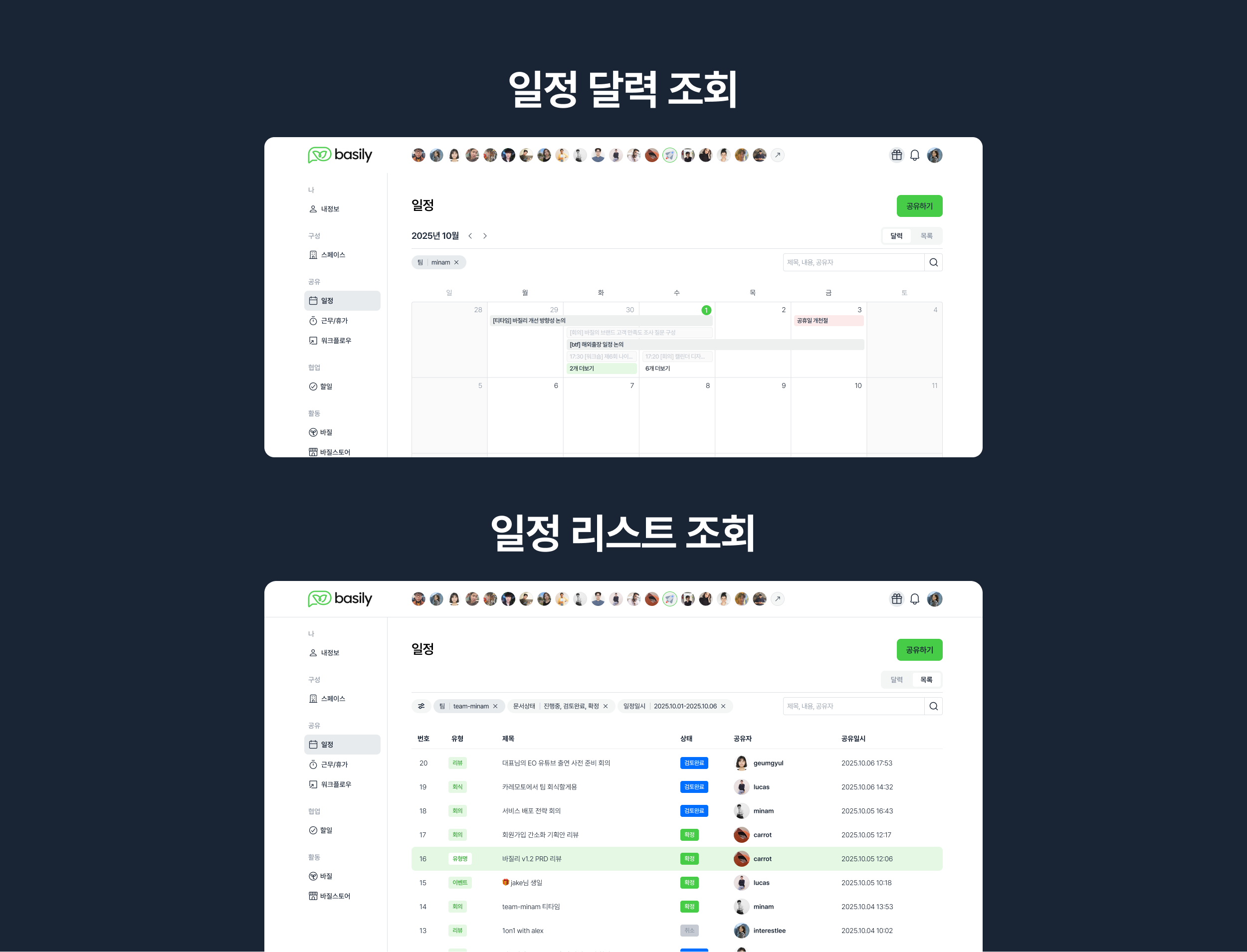이제 일정, 근무/휴가 메뉴에서 관련 문서를 바로 확인할 수 있어요.