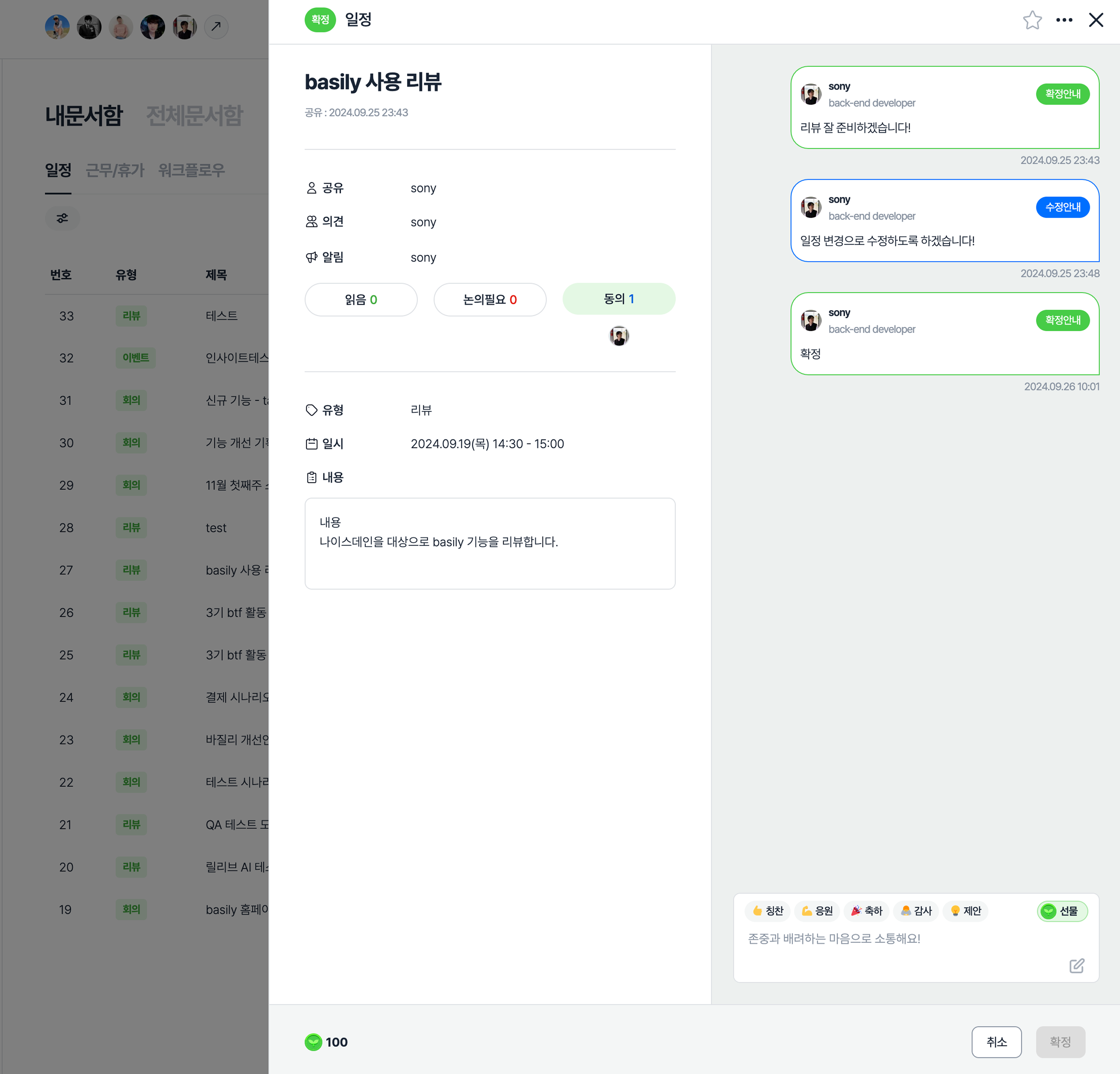 모든 문서에 의견 선택 및 확정, 취소 처리를 할 수 있습니다.