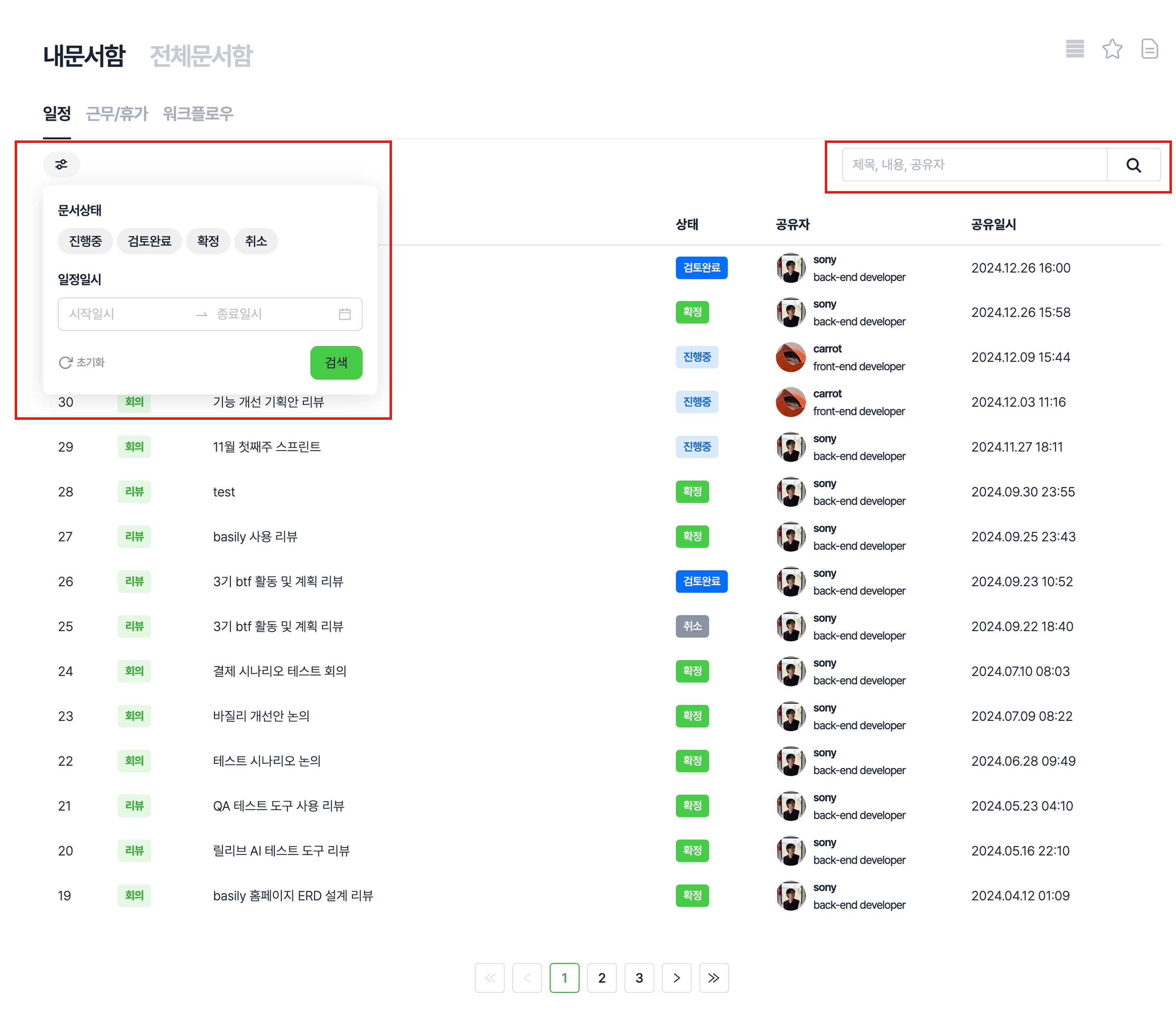 단계 2) 원하는 조건을 설정한 뒤 검색을 하면 해당 조건에 맞는 문서를 조회할 수 있습니다.