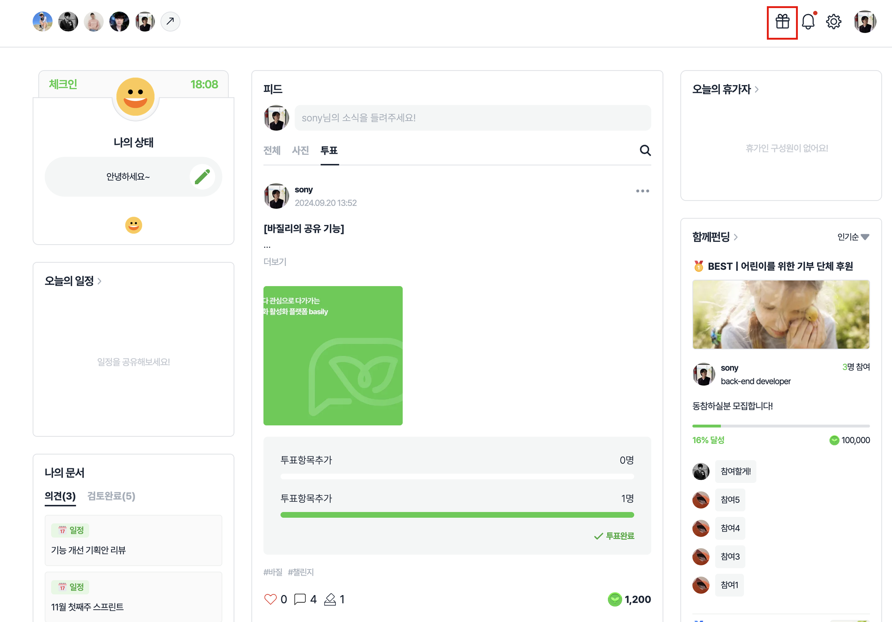 단계 1) 스페이스 우측 상단의 [선물하기] 아이콘을 클릭해주세요.
