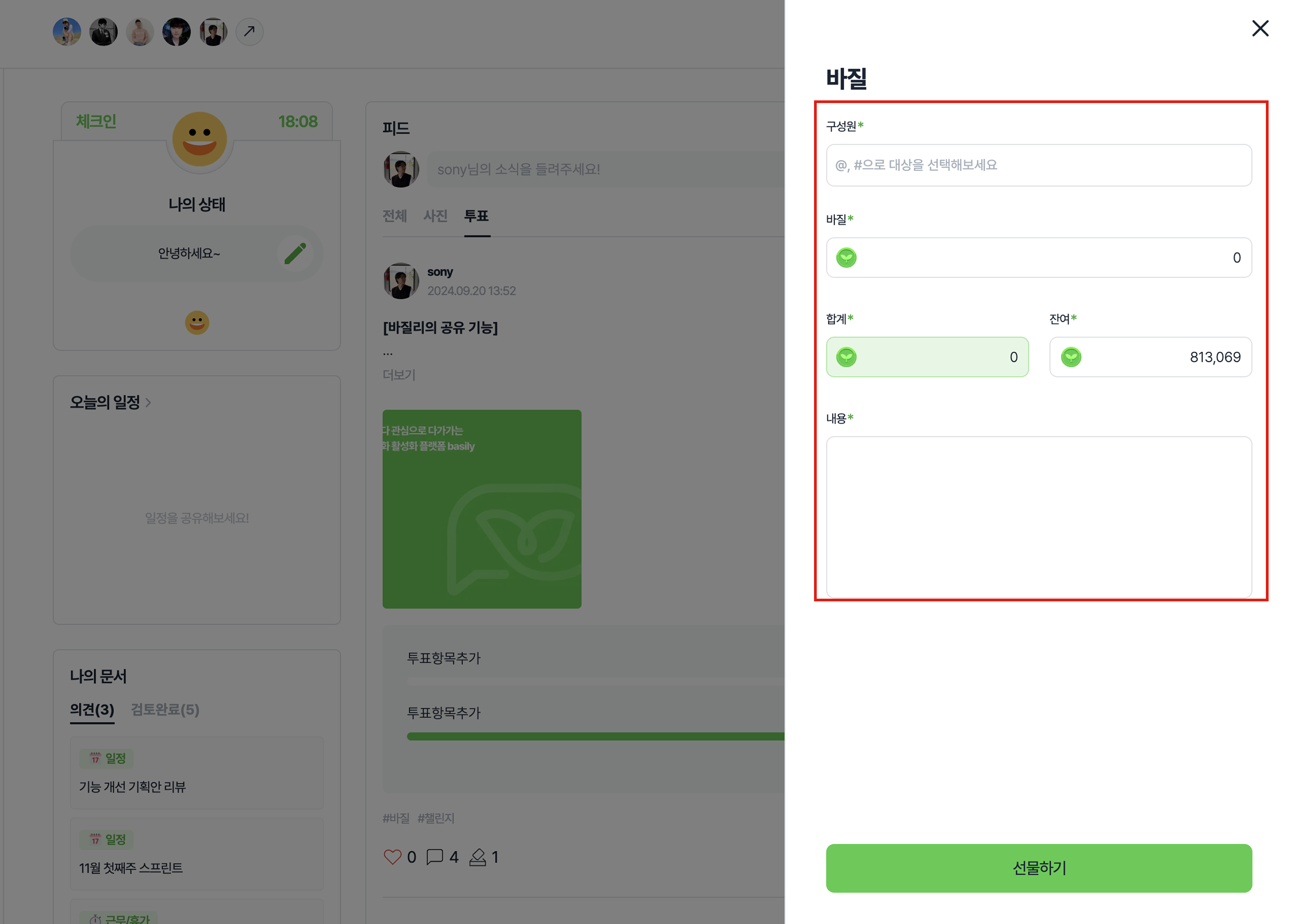 선물할 바질 : 대상 구성원에게 선물할 바질의 수를 입력할 수 있습니다.