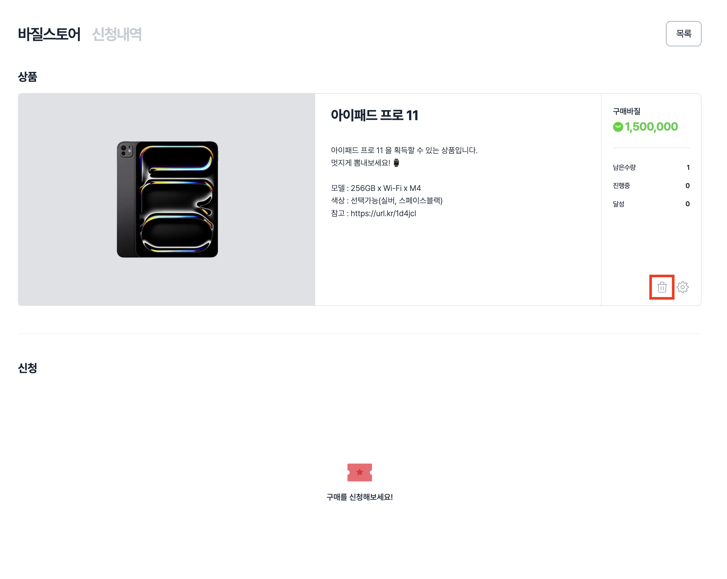 단계 1) 설정 > 활동 > 바질스토어 메뉴에서 삭제하려는 상품을 선택해주세요.