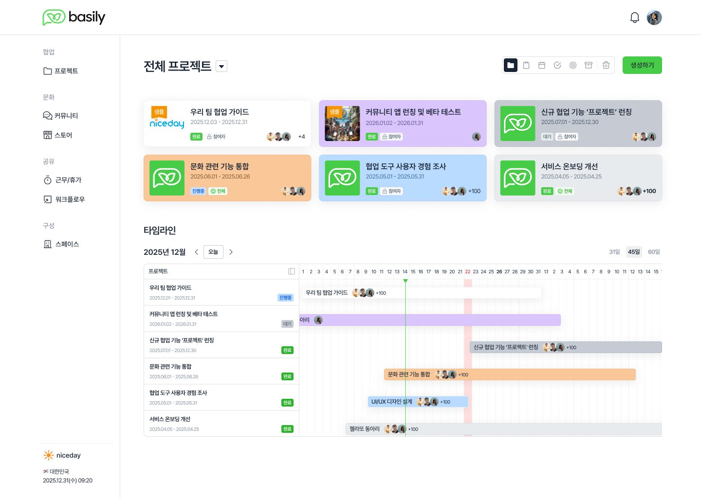 프로젝트 메뉴 안에서 자연스럽게 이어지는 협업 경험을 할 수 있습니다.