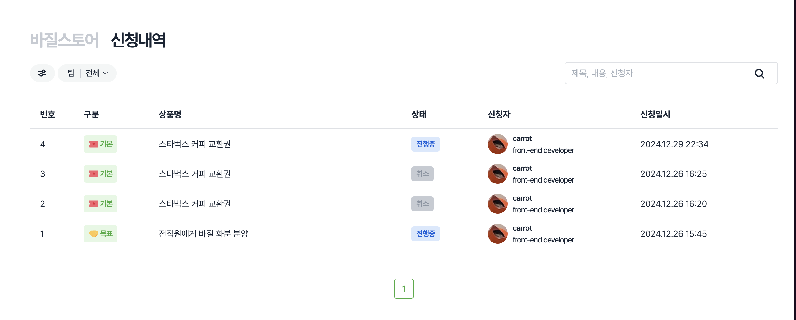 신청내역 목록을 조회할 수 있습니다.