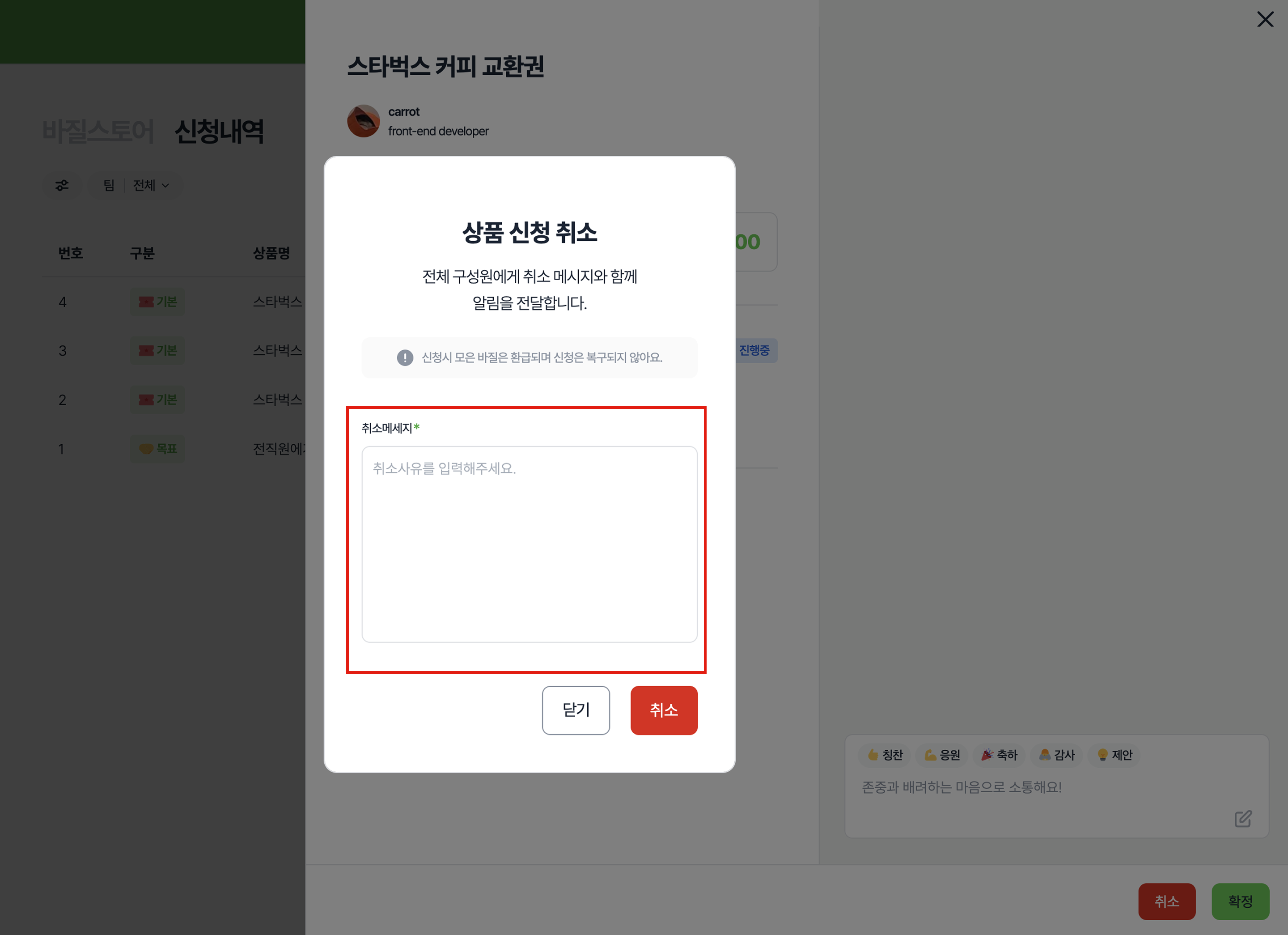 단계 4-2) 취소시 사유를 입력 후 [취소] 버튼을 클릭해주세요.