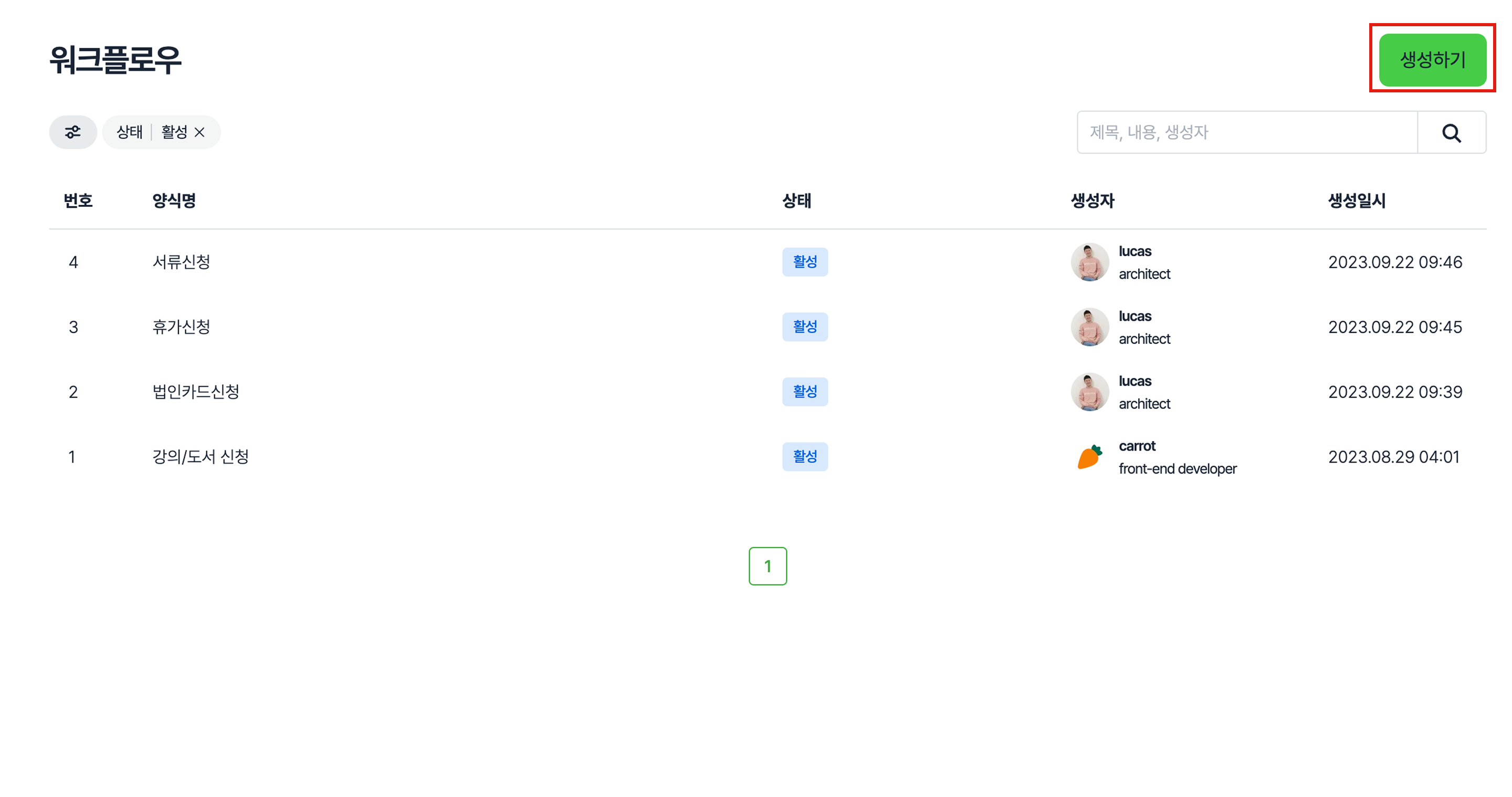 단계 1) 설정 > 문서 > 워크플로우 메뉴에서 우측 상단의 [생성하기] 버튼을 클릭해주세요.