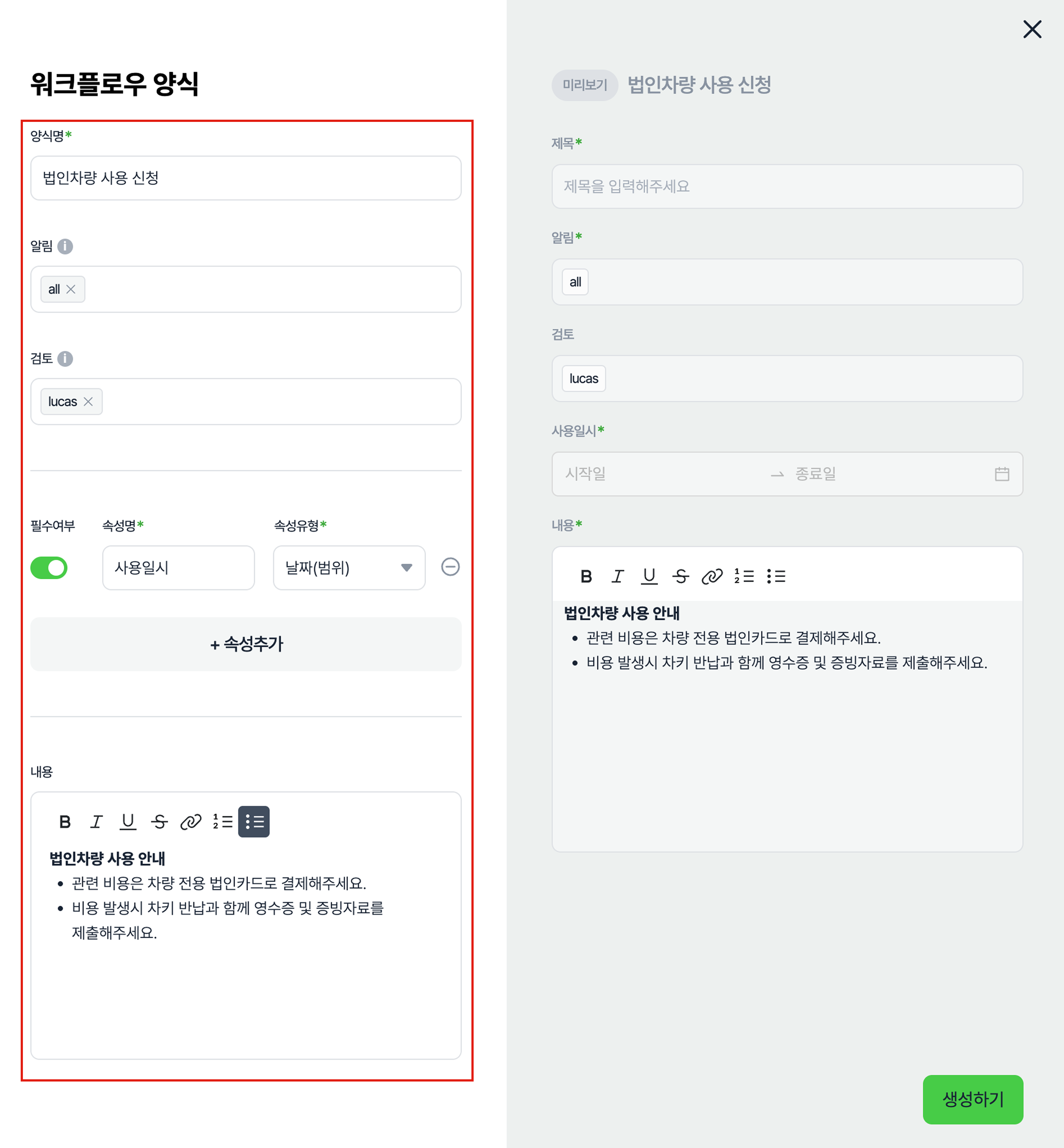 단계 3) 화면 오른쪽에 노출되는 미리보기 영역을 확인 후 [생성하기] 버튼을 클릭하면 양식 등록이 완료됩니다.
