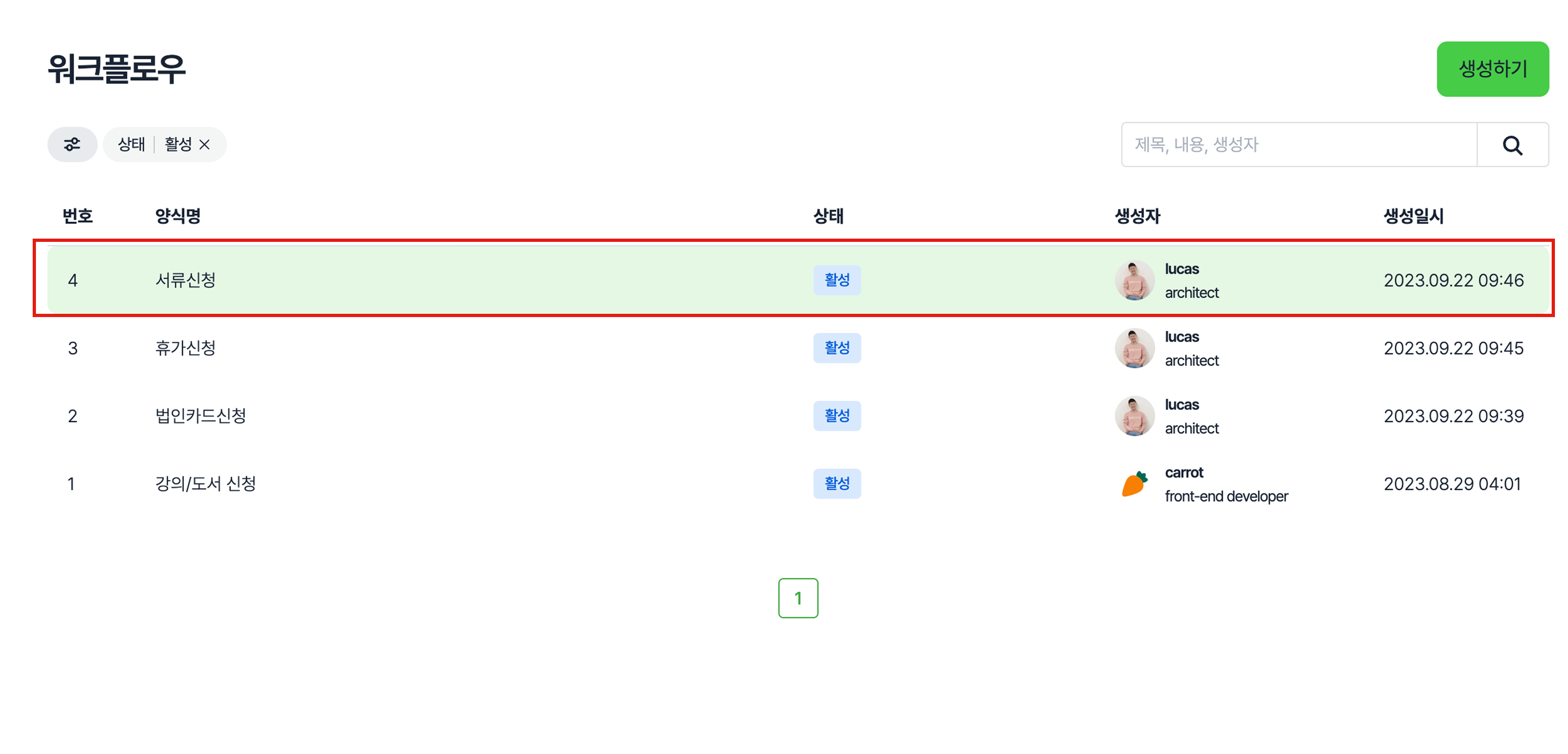 단계 1) 설정 > 문서 > 워크플로우 메뉴에서 상태를 변경하려는 양식을 클릭해주세요.