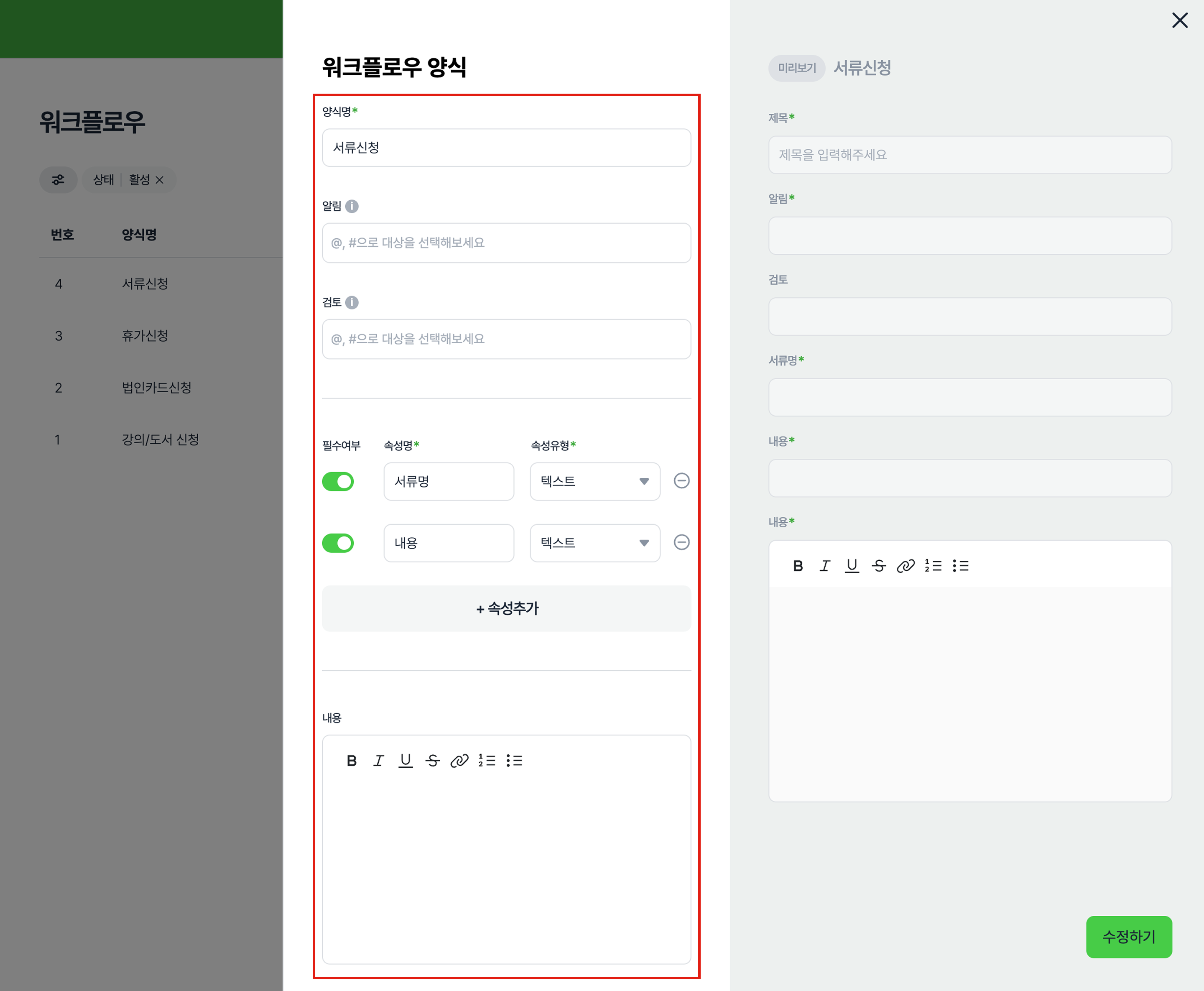 수정한 양식은 문서-워크플로우 등록 시 사용할 수 있습니다.