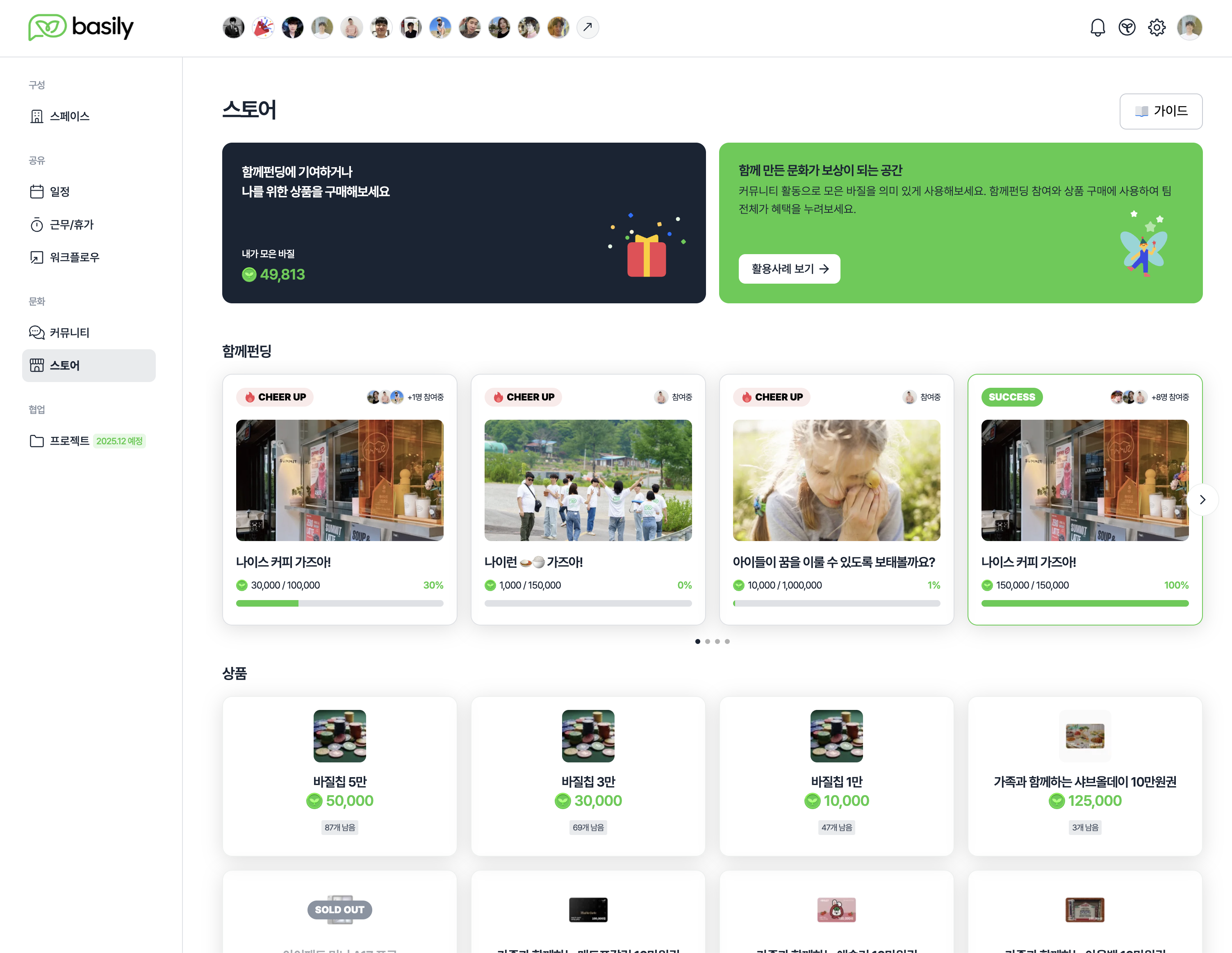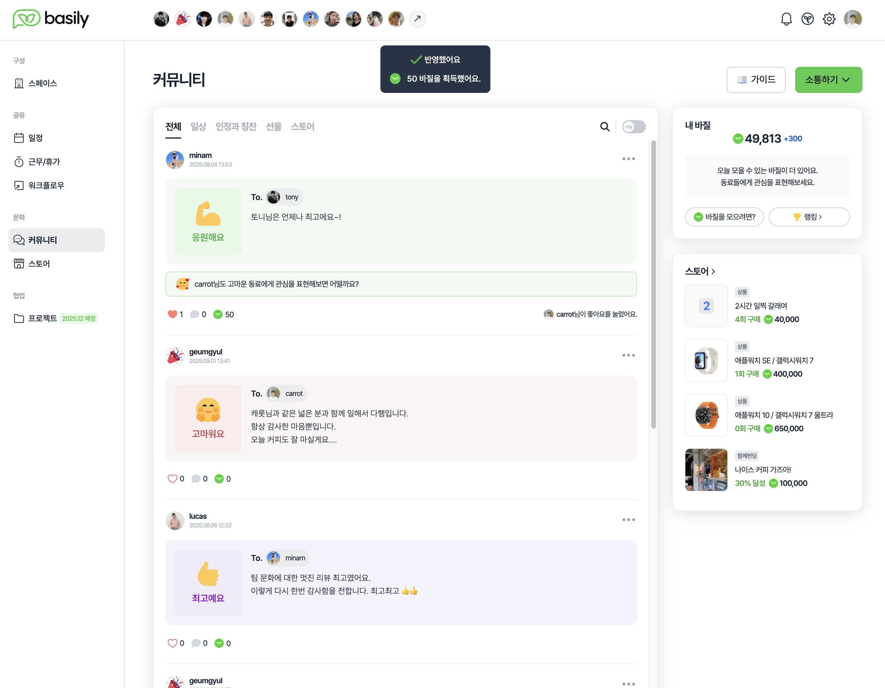 ‘일상’, ‘인정과 칭찬’, ‘바질 선물’, ‘스토어’ 등 다양한 소통 기능이 커뮤니티 메뉴로 통합되었어요.