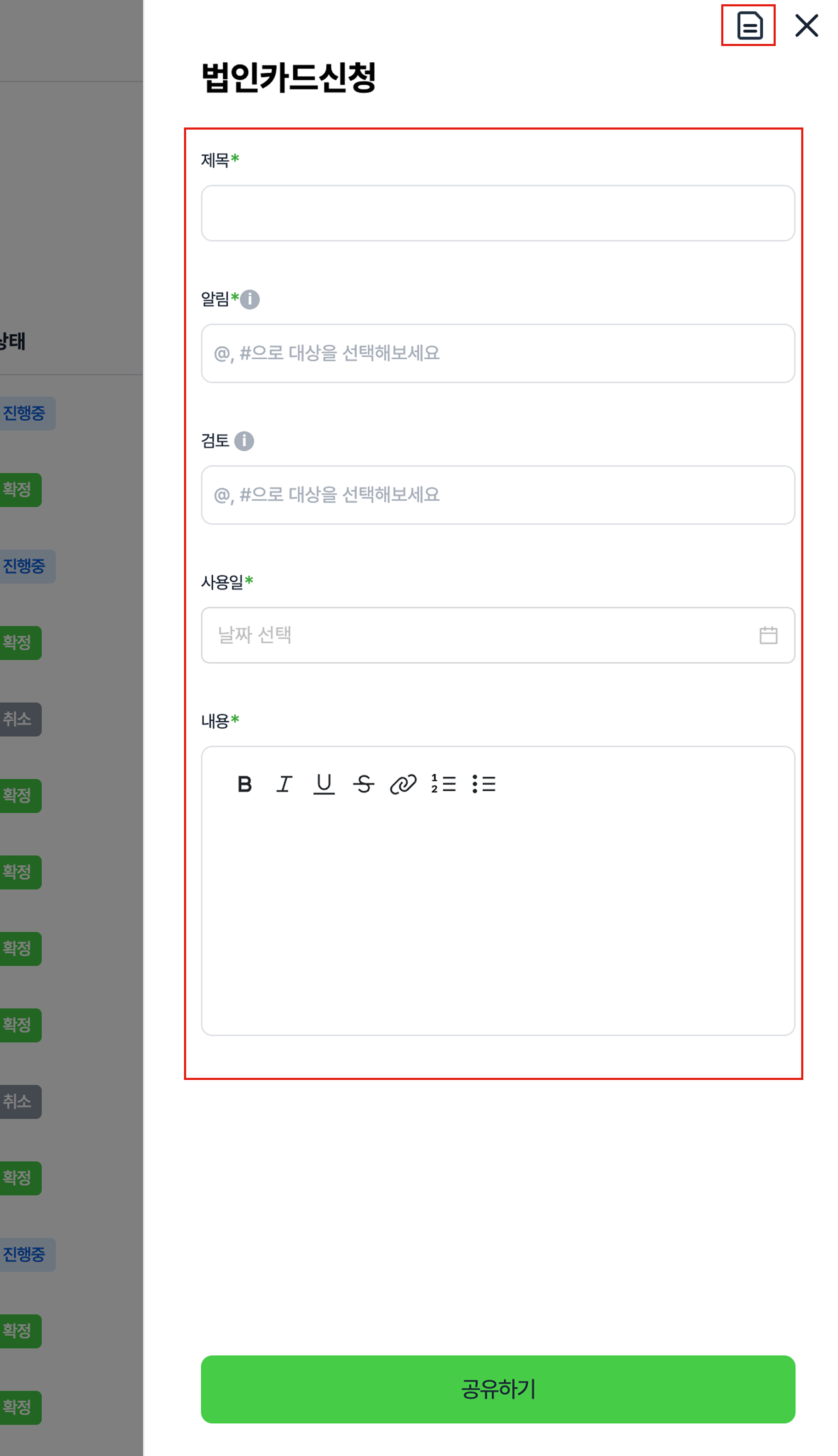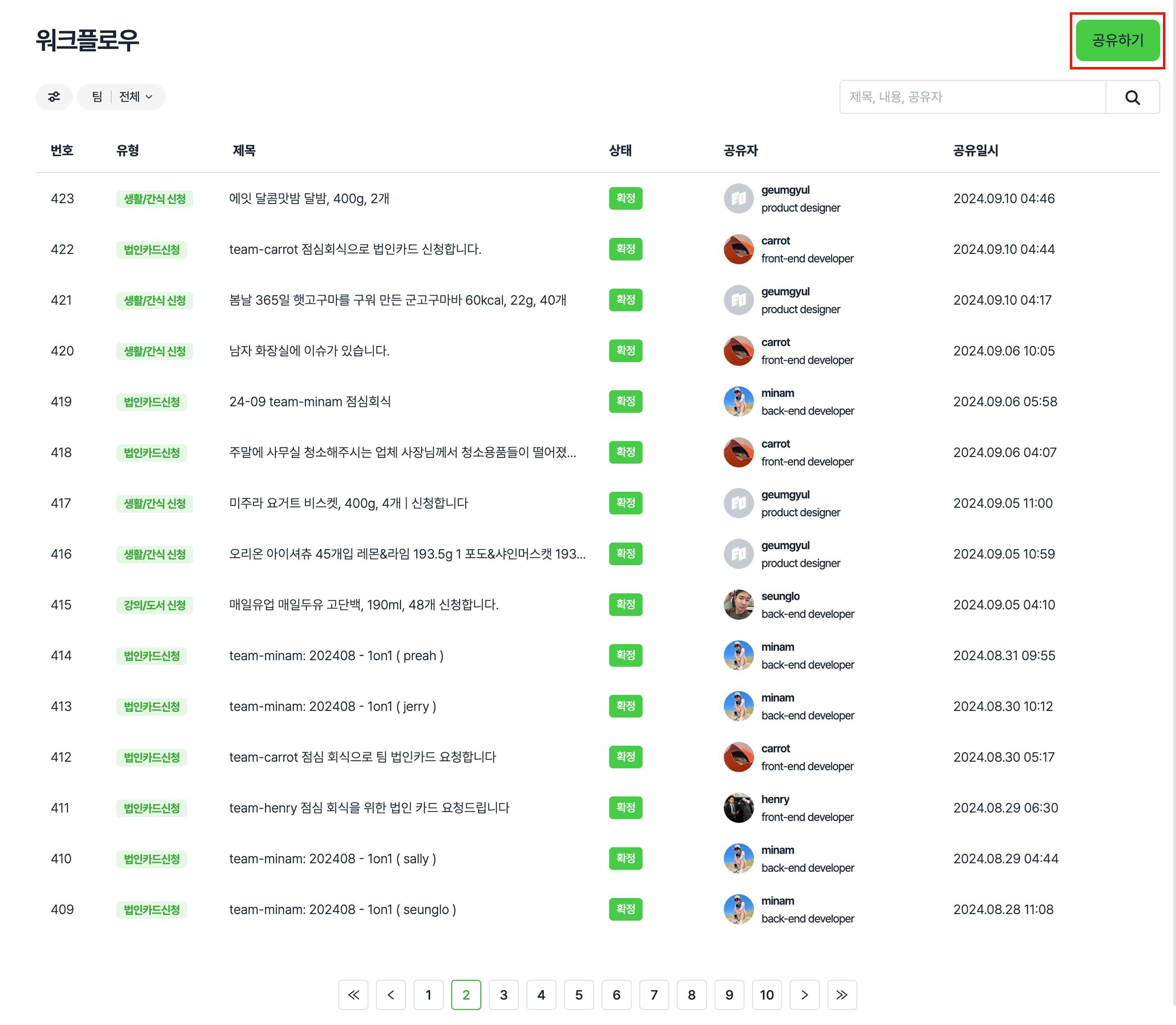 단계 1) 문서 > 워크플로우 화면 우측 상단에 [공유하기] 버튼을 클릭해주세요.