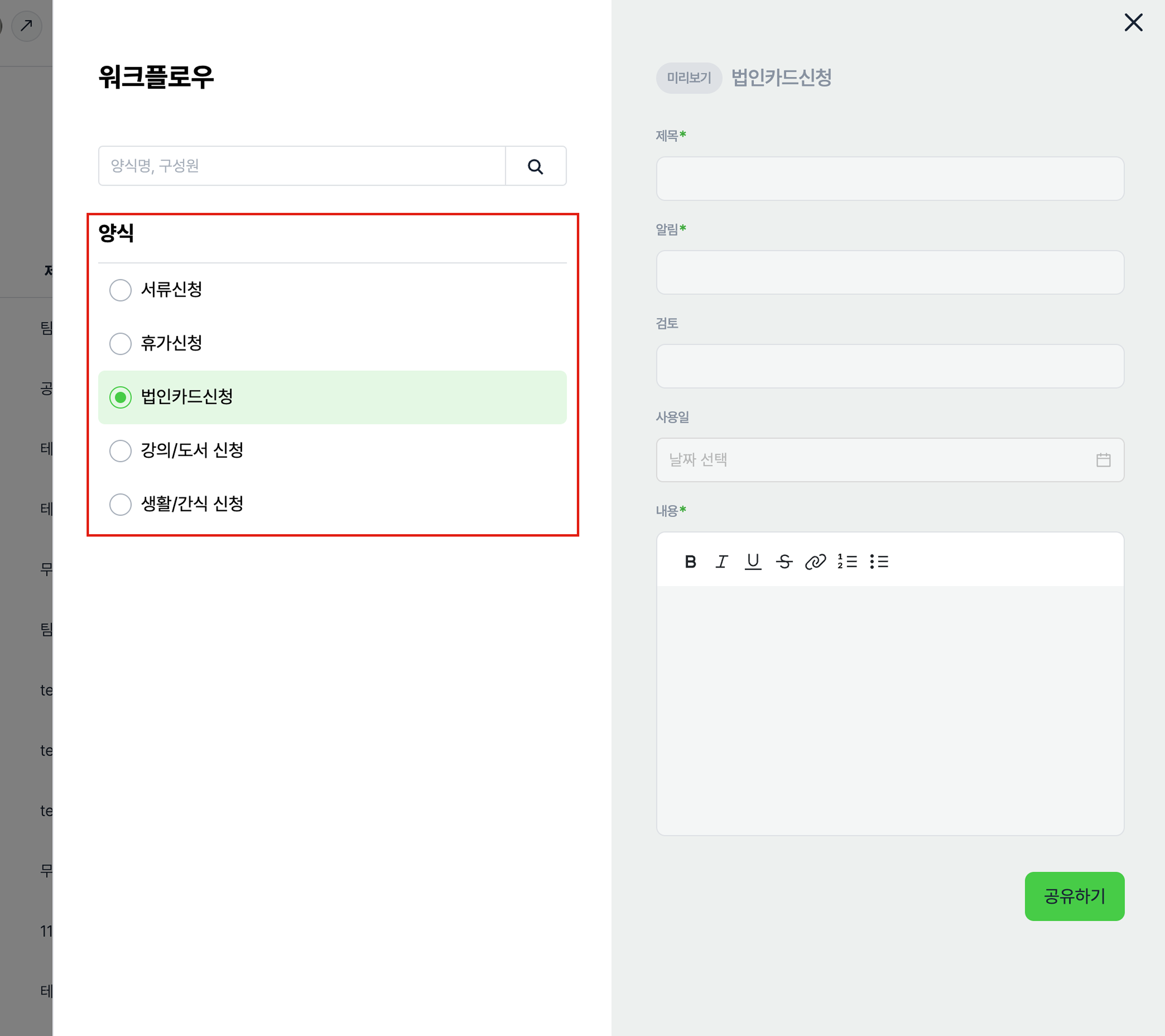 담당자가 생성한 워크플로우 양식 중 한 가지를 선택할 수 있습니다.
