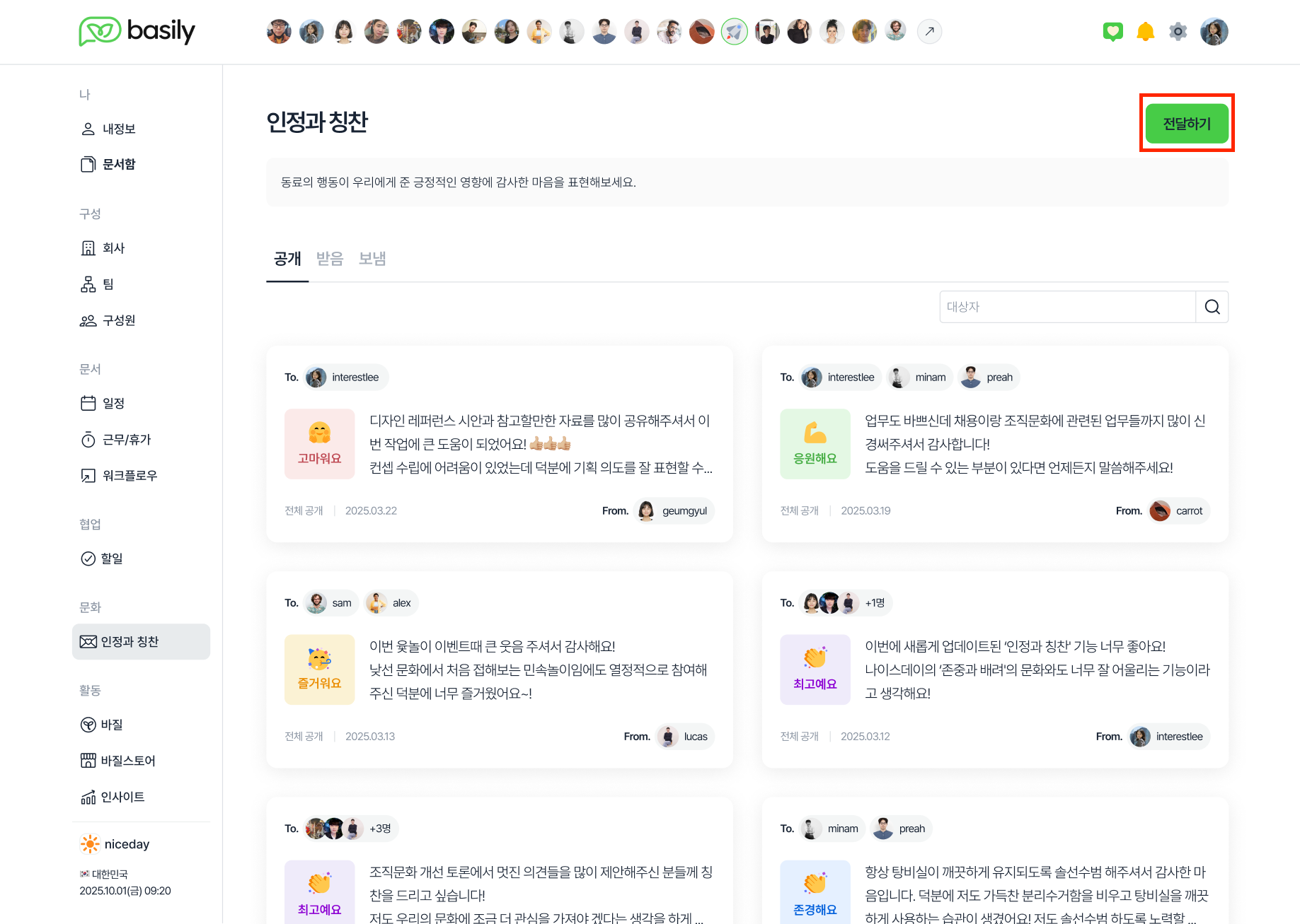 단계 1) 인정과 칭찬 메뉴에서 우측 상단에 있는 [전달하기] 버튼을 클릭해주세요.