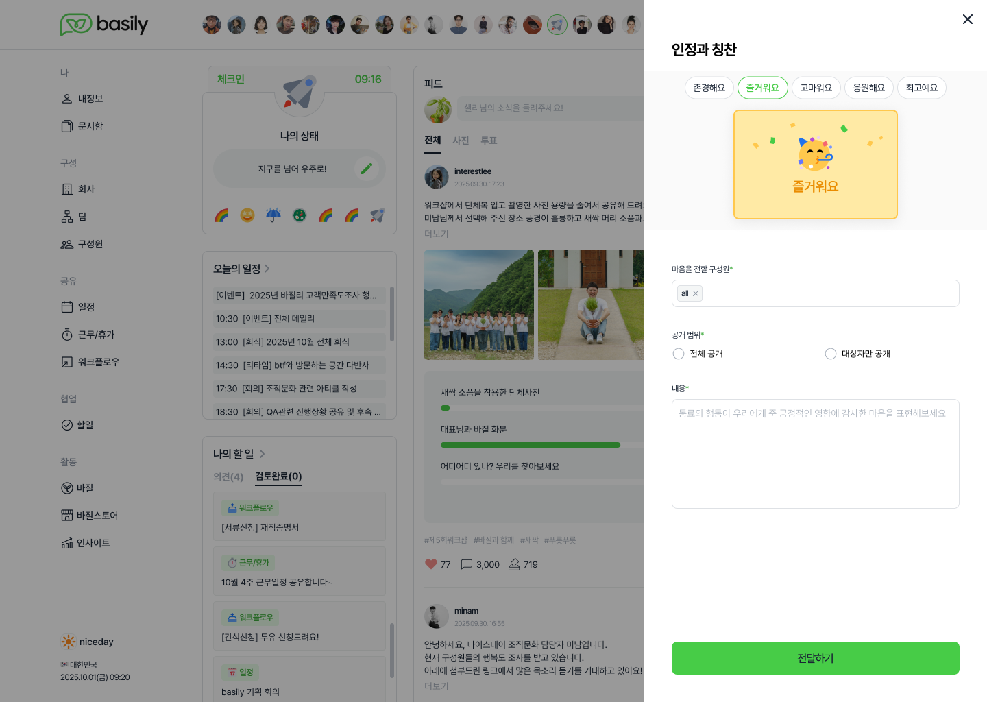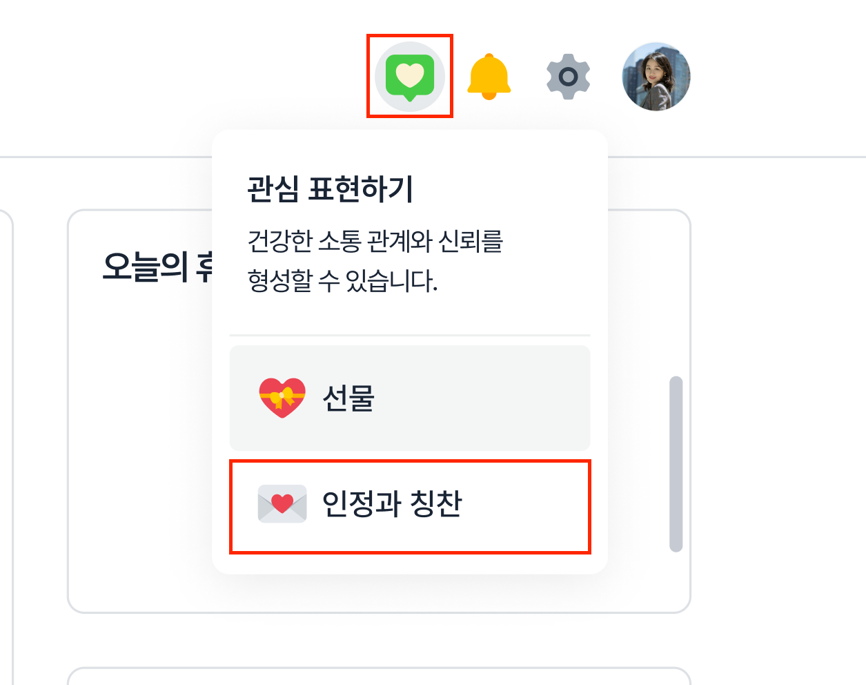 인정과 칭찬 전달하기는 화면 우측 상단의 [관심 표현하기] 아이콘을 통해서도 접근할 수 있습니다.