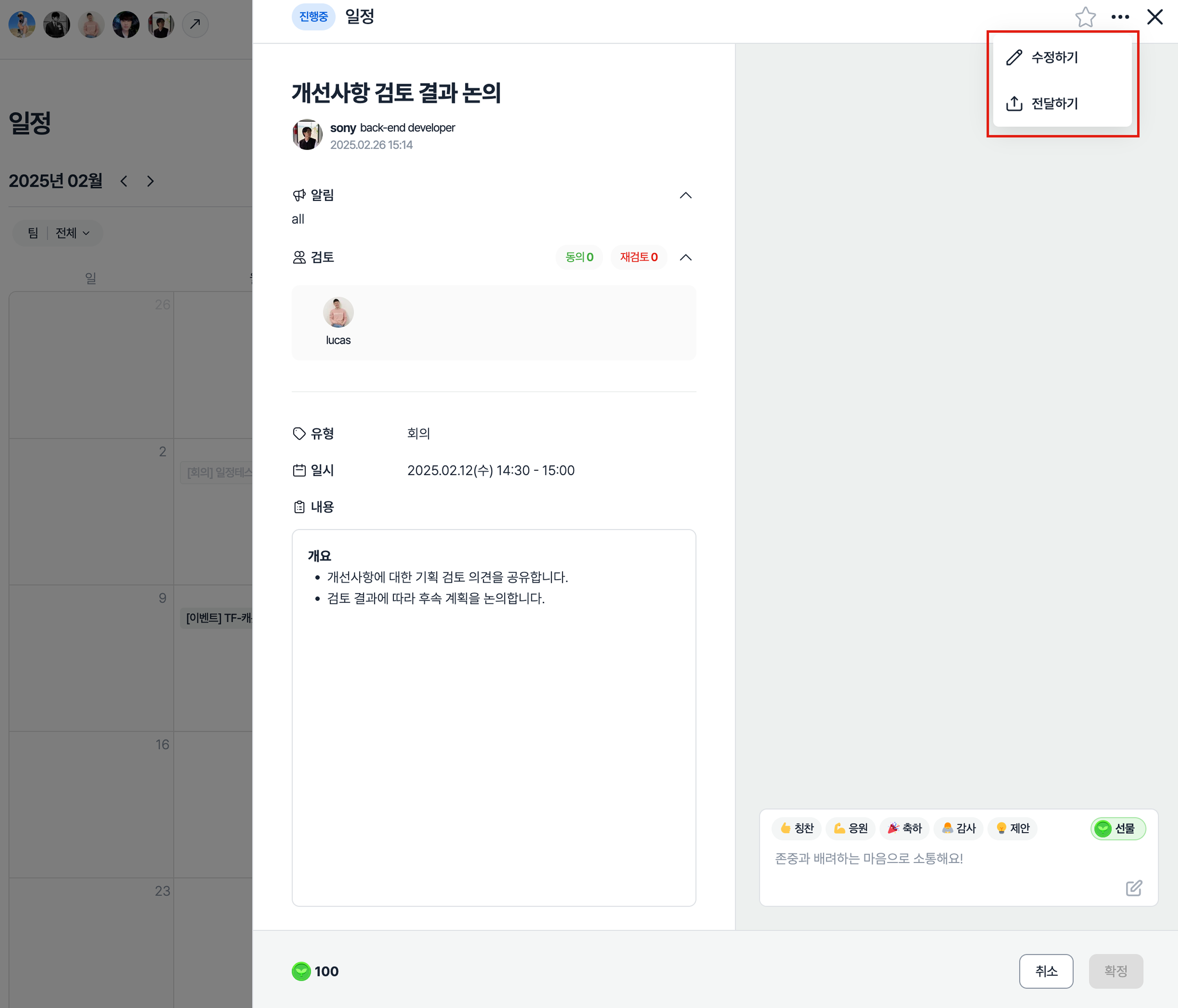 단계 1) 문서 > 일정 > 일정 상세조회 > 더보기 메뉴에서 수정하기 버튼을 클릭해주세요.