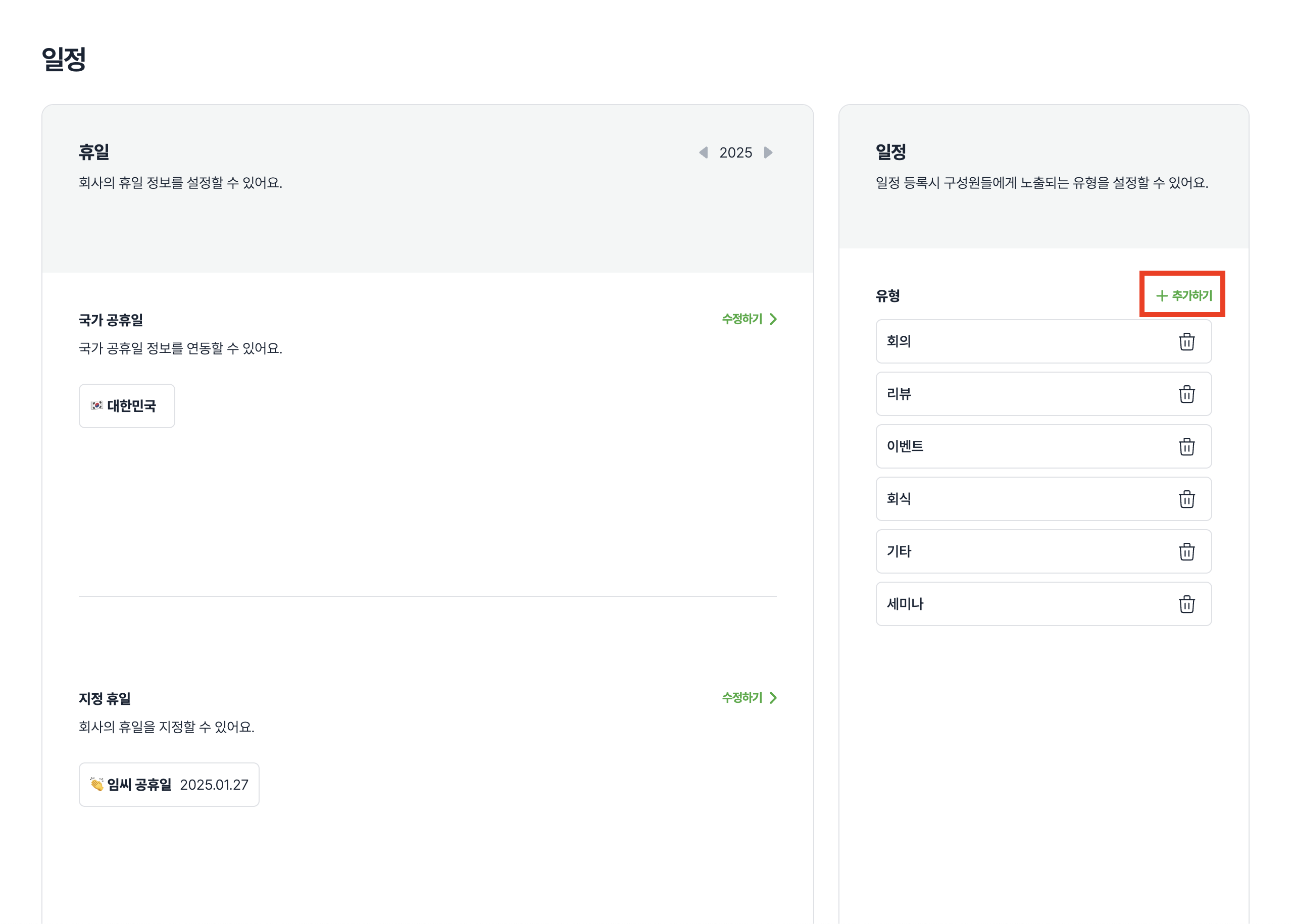 단계 1) 설정 > 공유 > 일정 메뉴에서 일정 유형 [+추가하기] 버튼을 클릭해주세요.
