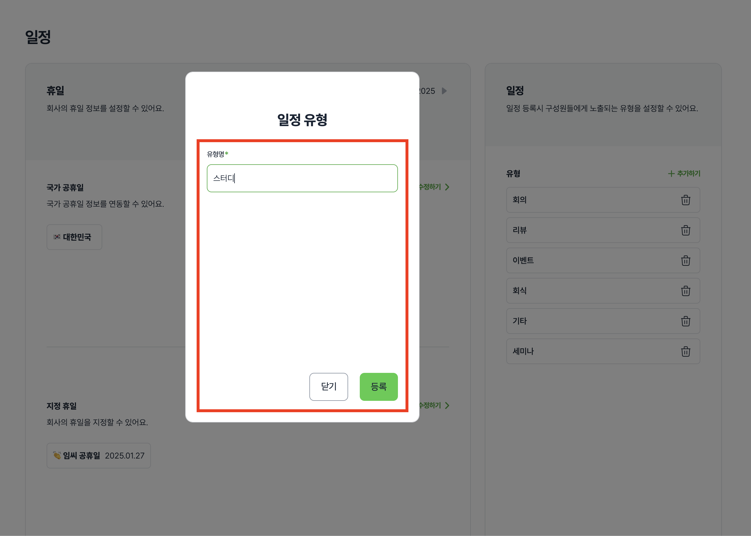 일정 등록시 사용되는 유형을 추가할 수 있습니다.