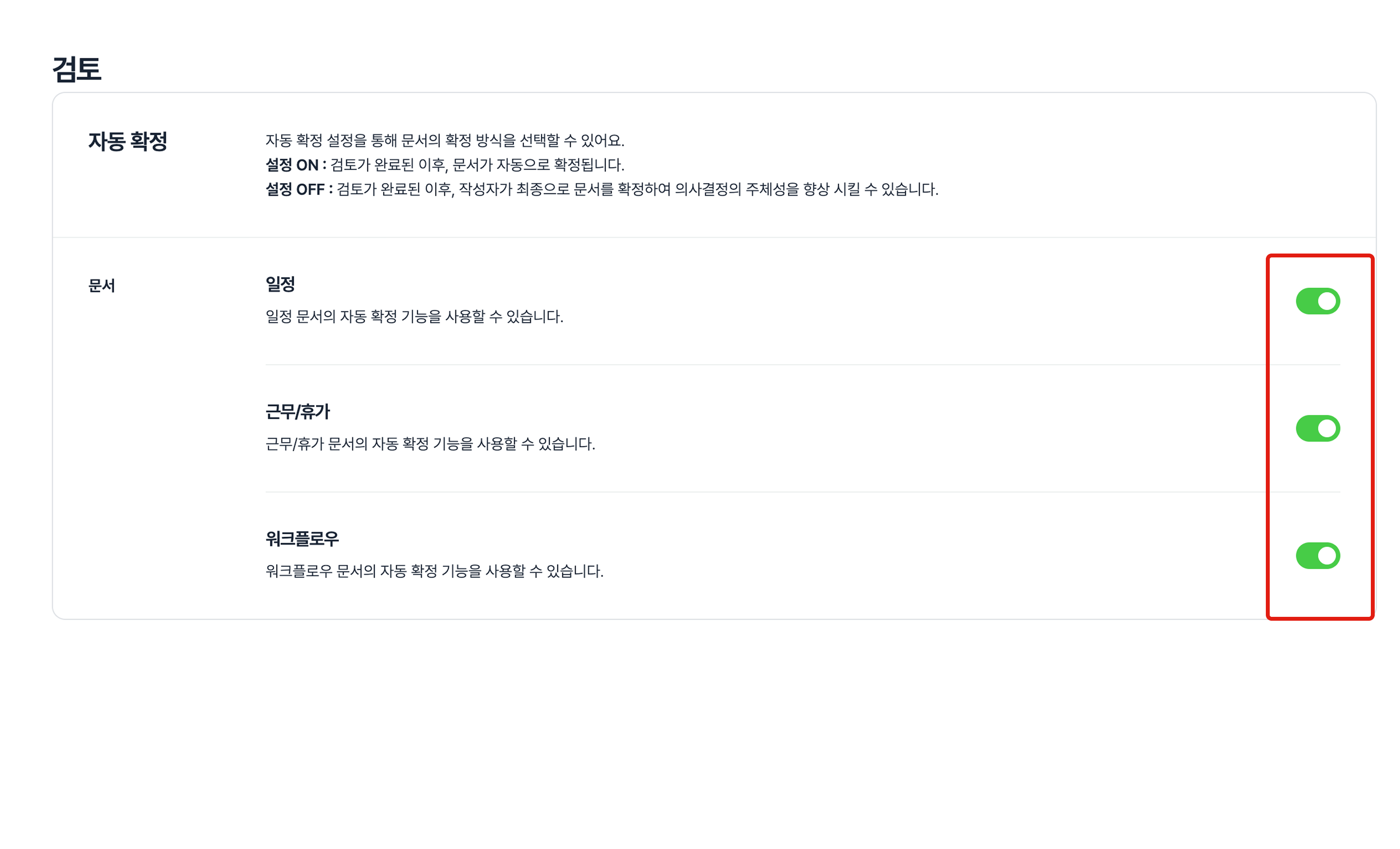 자동 확정 기능 ON - 모든 검토자가 승인했을 때 → 자동으로 확정 상태로 변경됩니다.
