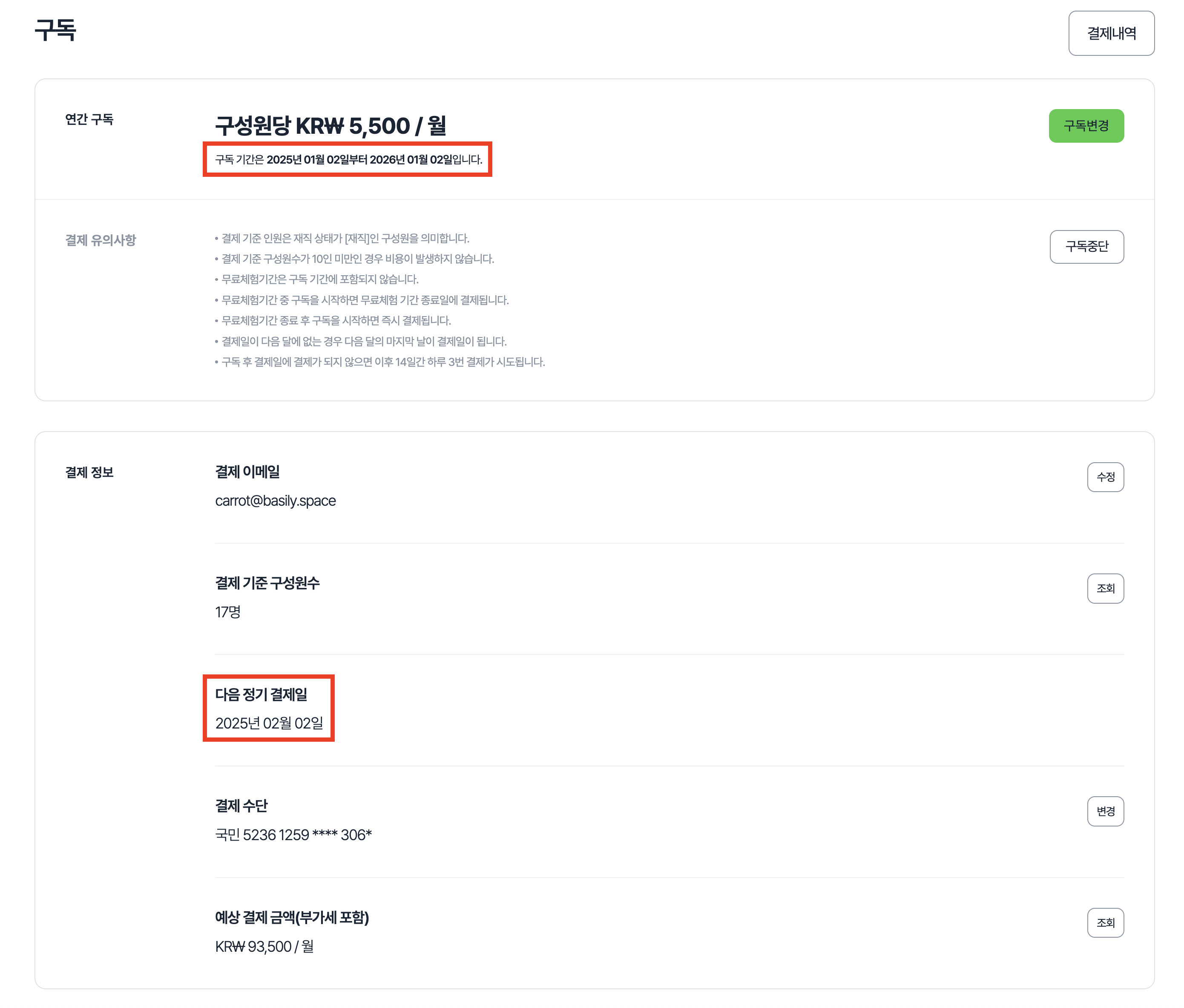 다음 정기 결제일에 결제 기준 구성원수에 포함됩니다.