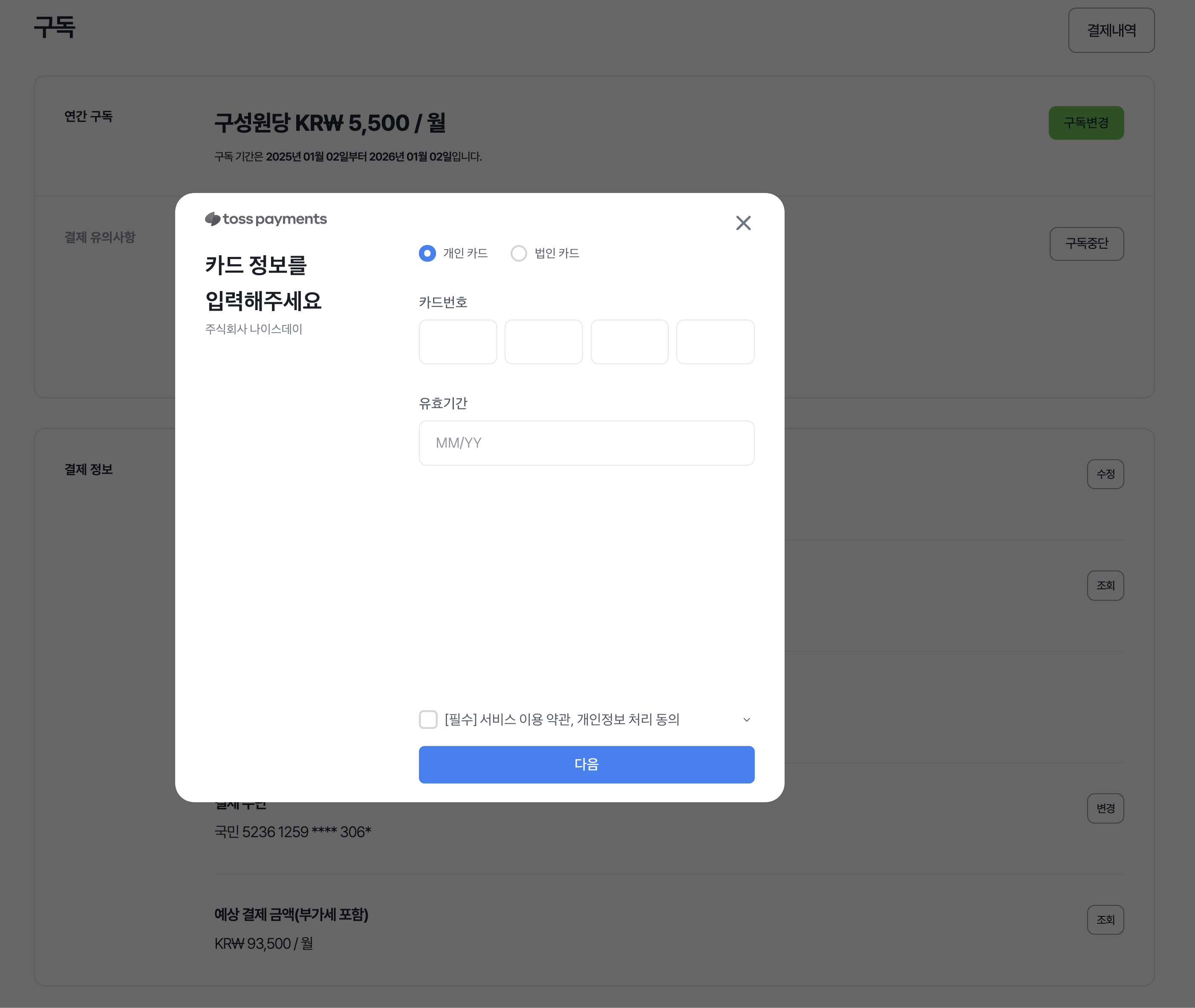 구독 하기 단계에서 카드 등록 및 본인인증 단계 완료시 즉시 결제됩니다.