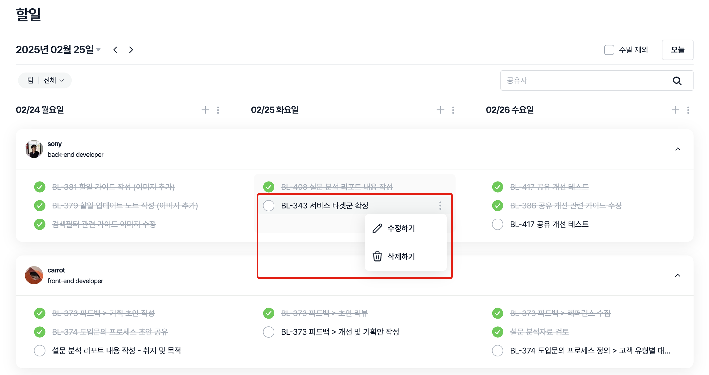 단계 1) 협업 > 할일 목록 화면에서 변경할 체크리스트 [더보기] 메뉴를 클릭하여 [수정하기] 버튼을 눌러주세요.