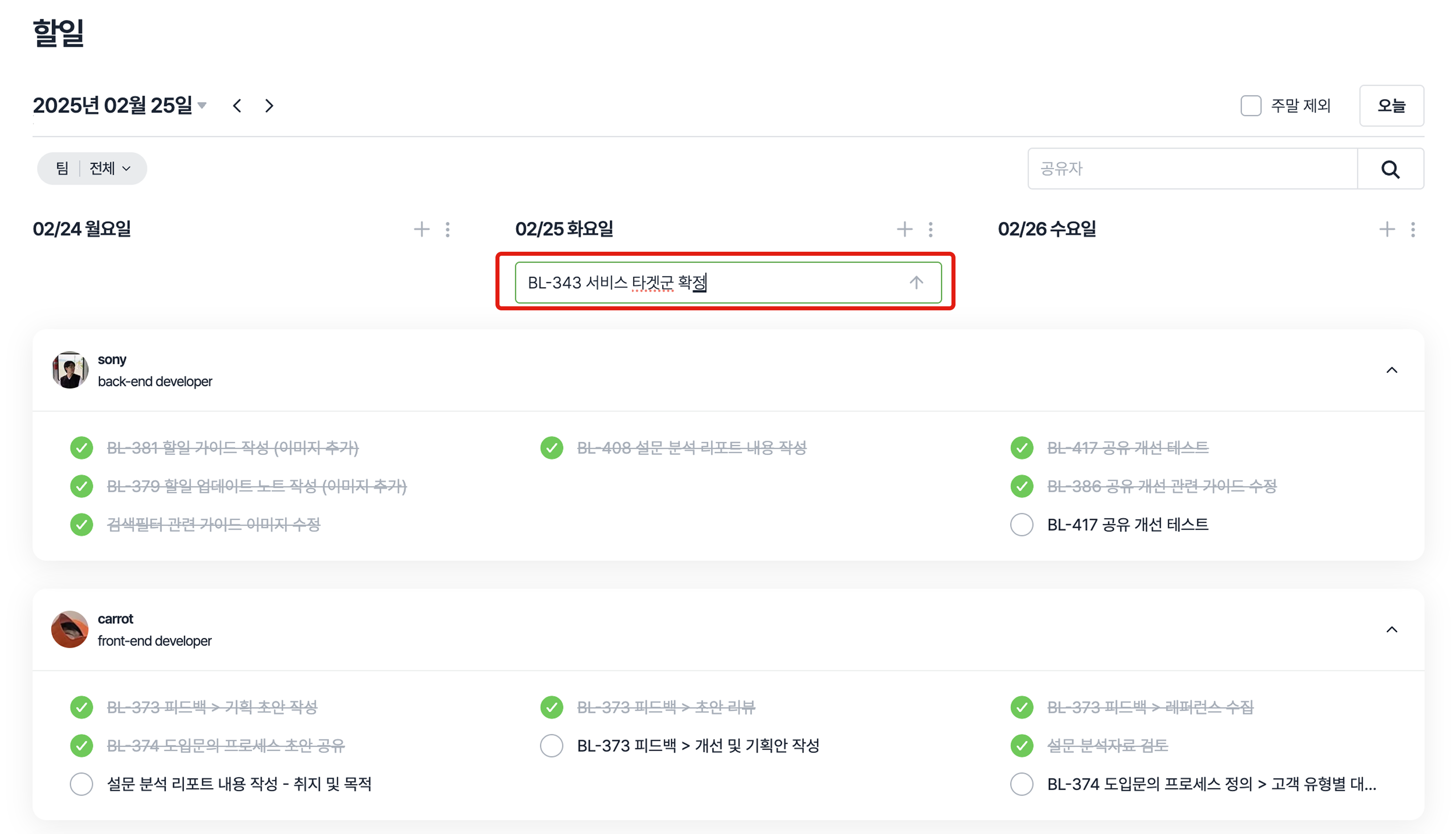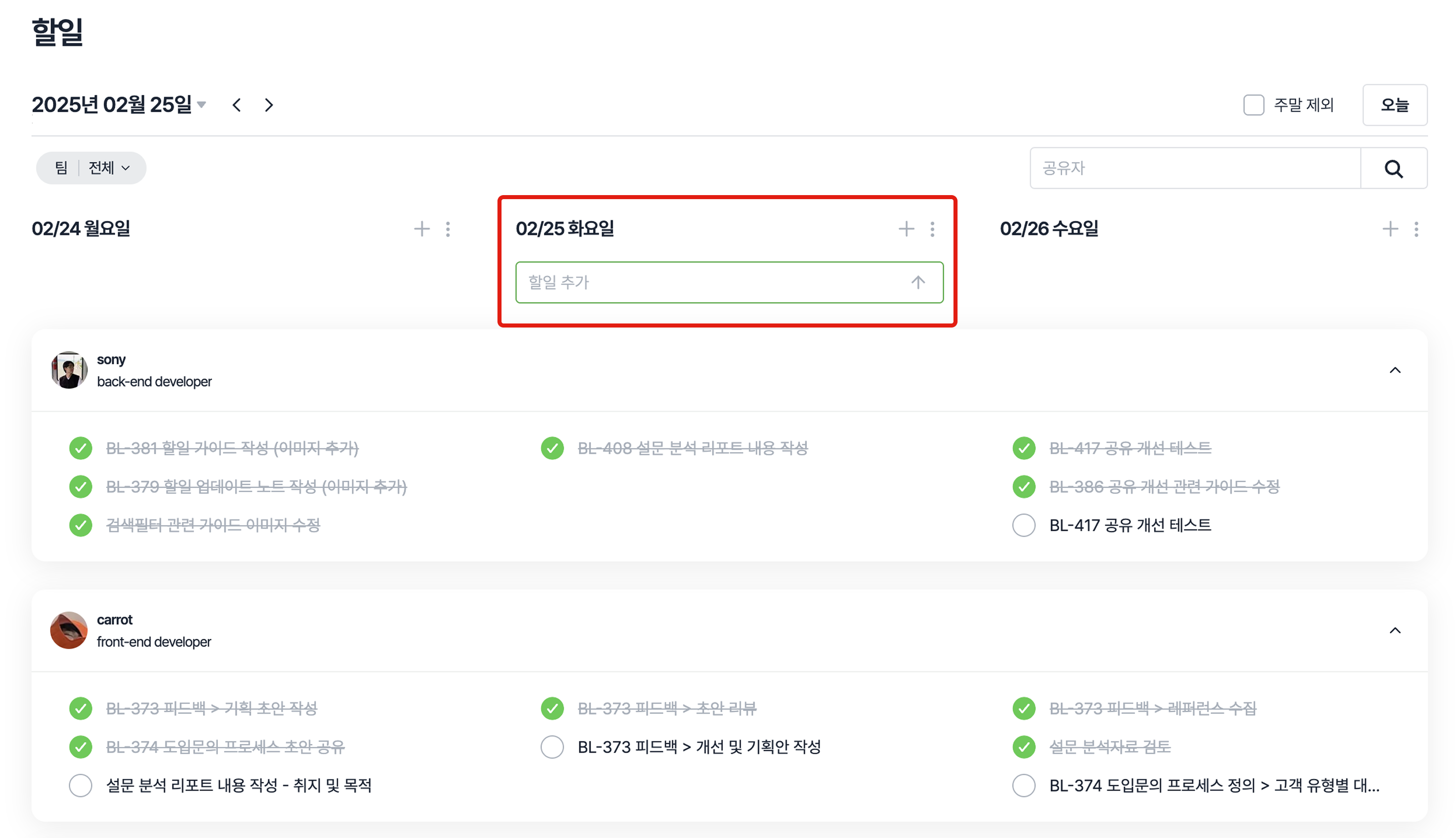 단계 1) 협업 > 할일 화면의 날짜 옆에 있는 [+] 버튼을 클릭해주세요.