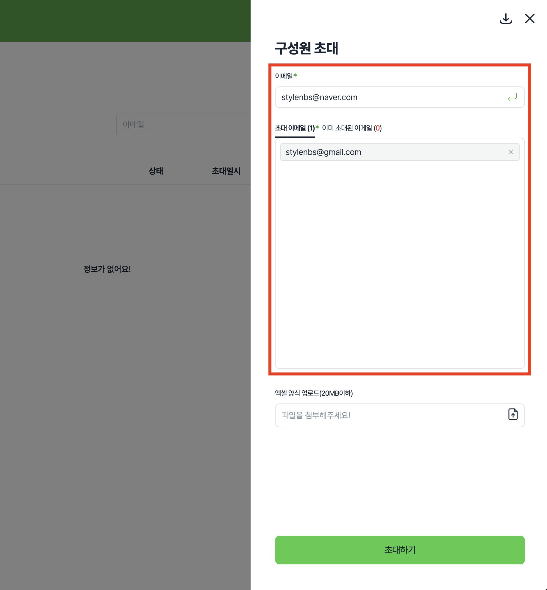엑셀 파일이 업로드 되면 초대 이메일 목록에 노출됩니다.