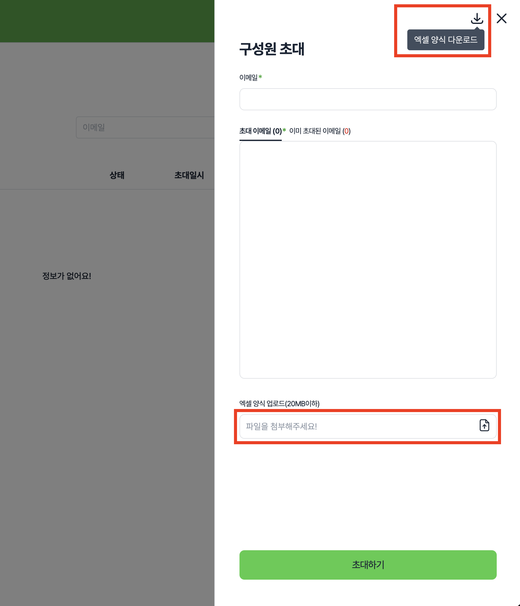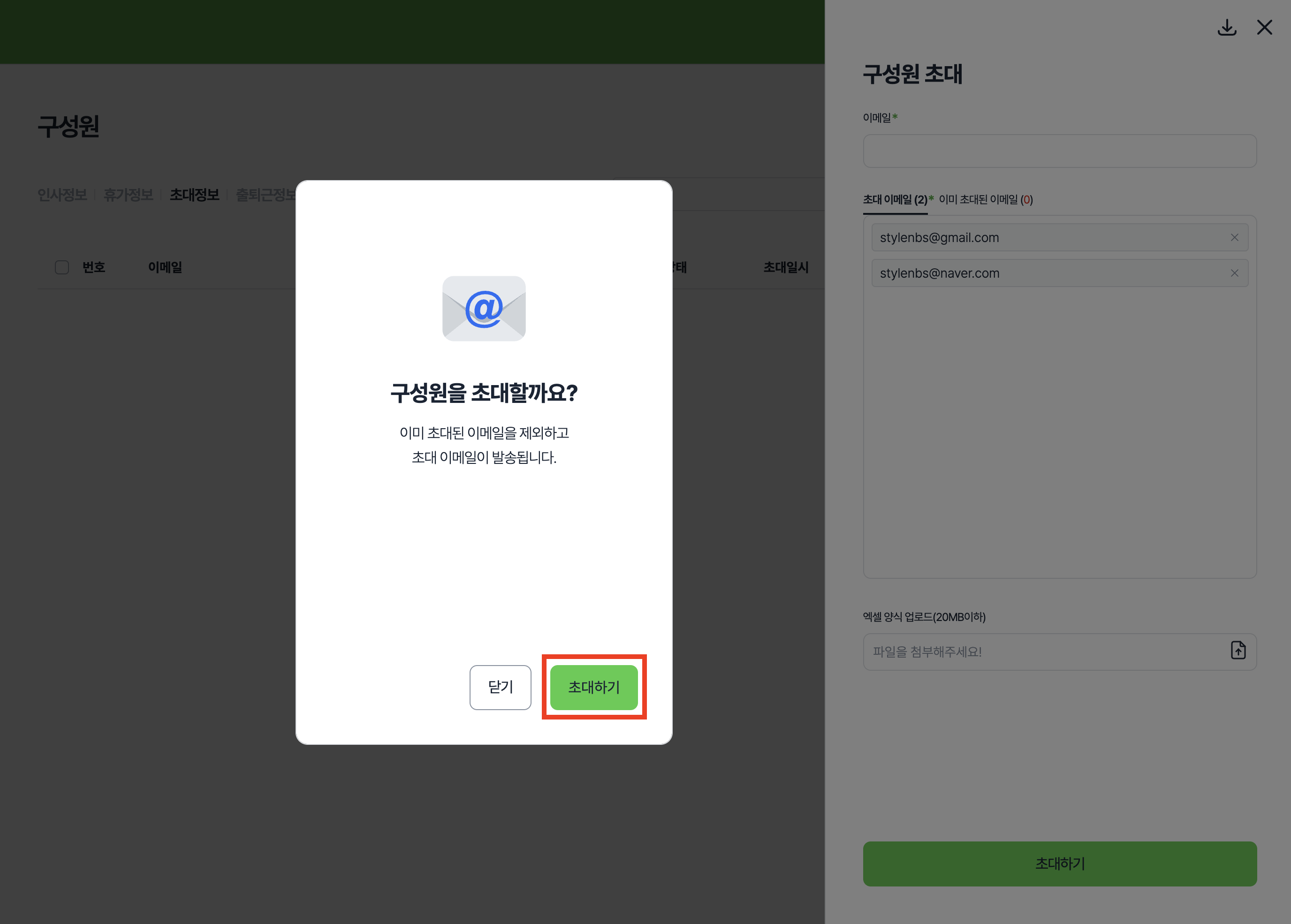단계 4) 엑셀 파일을 업로드하고 초대 이메일 목록을 확인한 뒤 [초대하기] 버튼을 클릭해주세요.