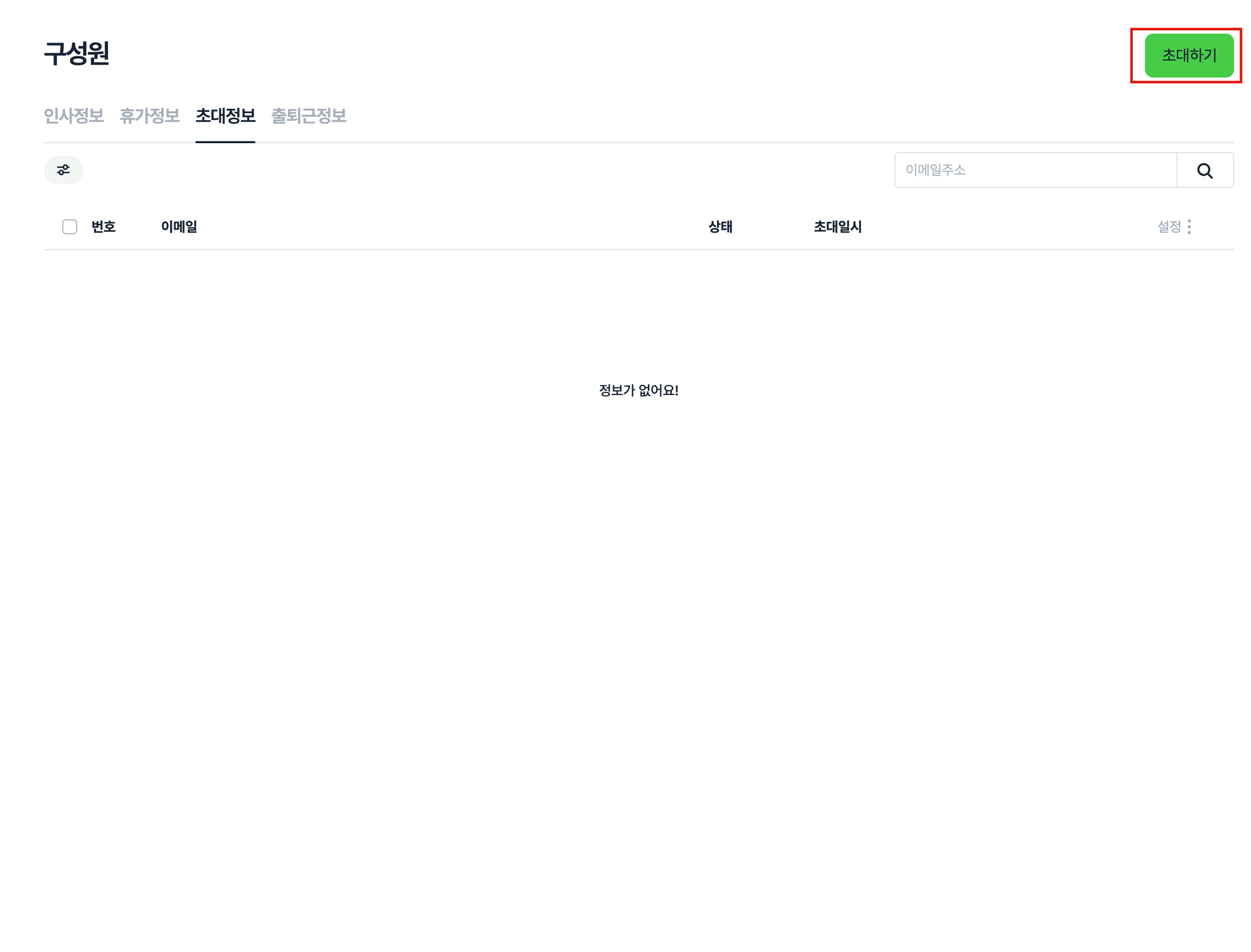 단계 1) 설정 > 구성 > 구성원 메뉴에서 [초대정보] 화면으로 이동합니다.