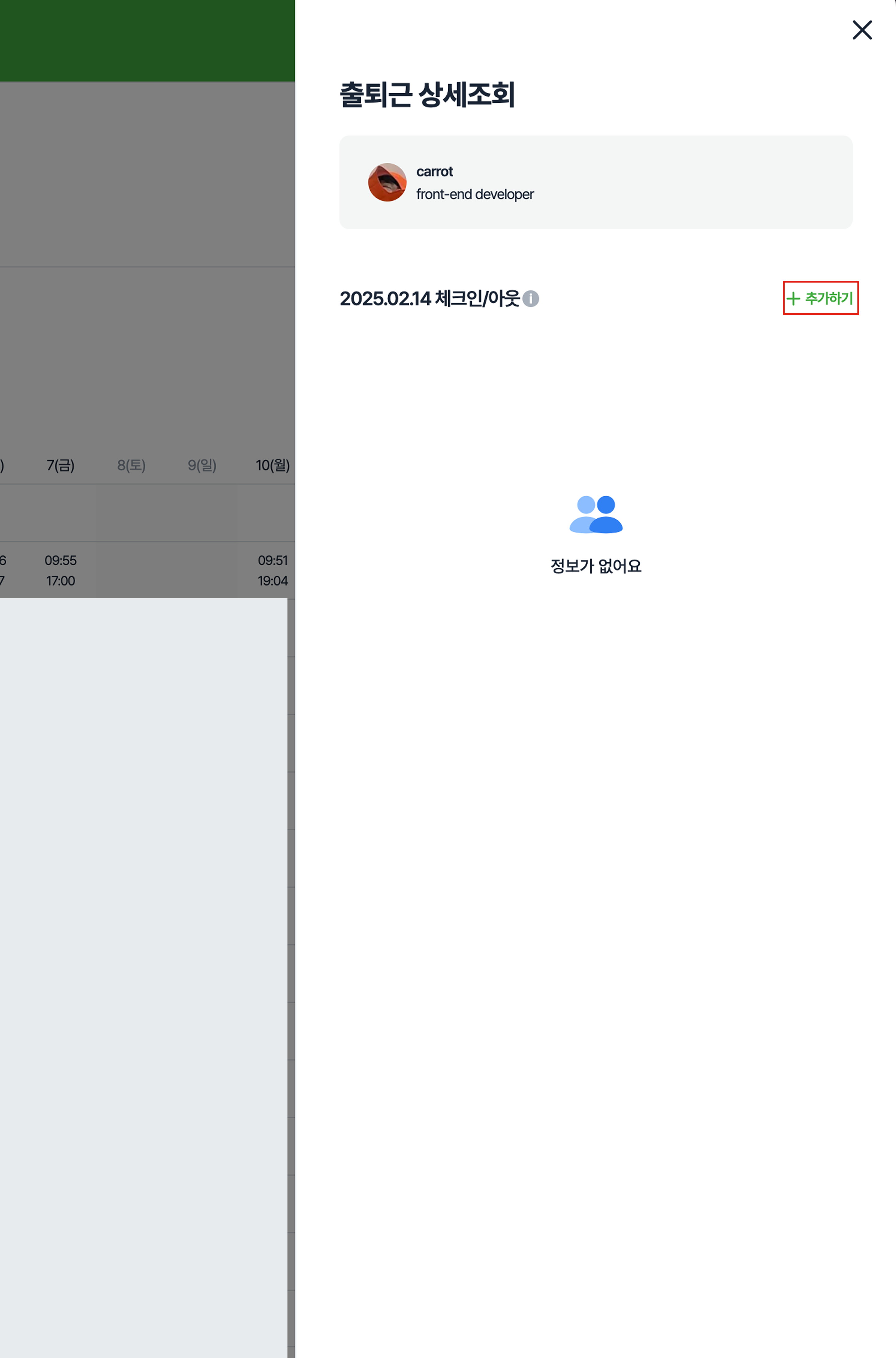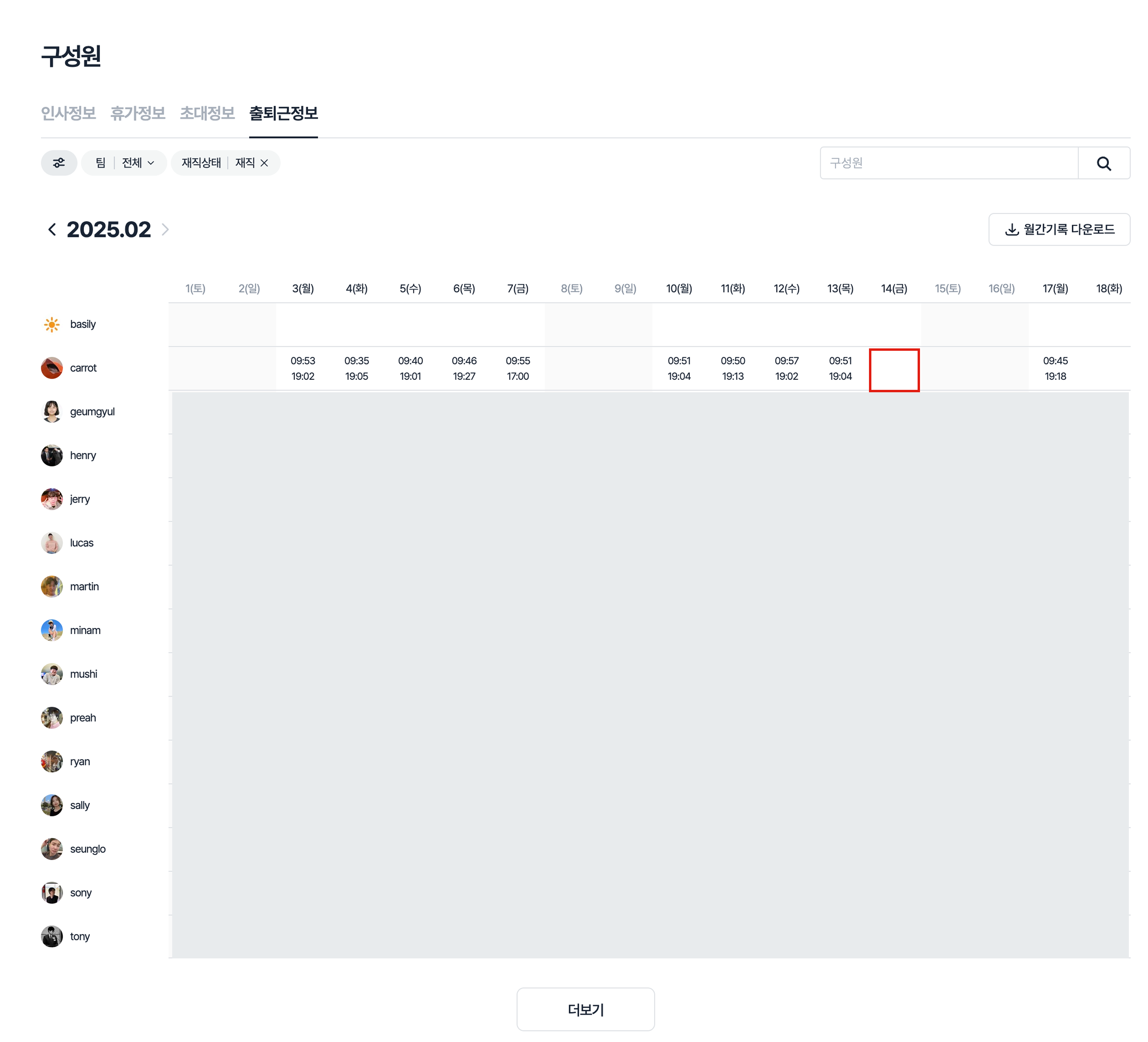 전체 구성원의 출퇴근 정보가 날짜별로 노출됩니다.