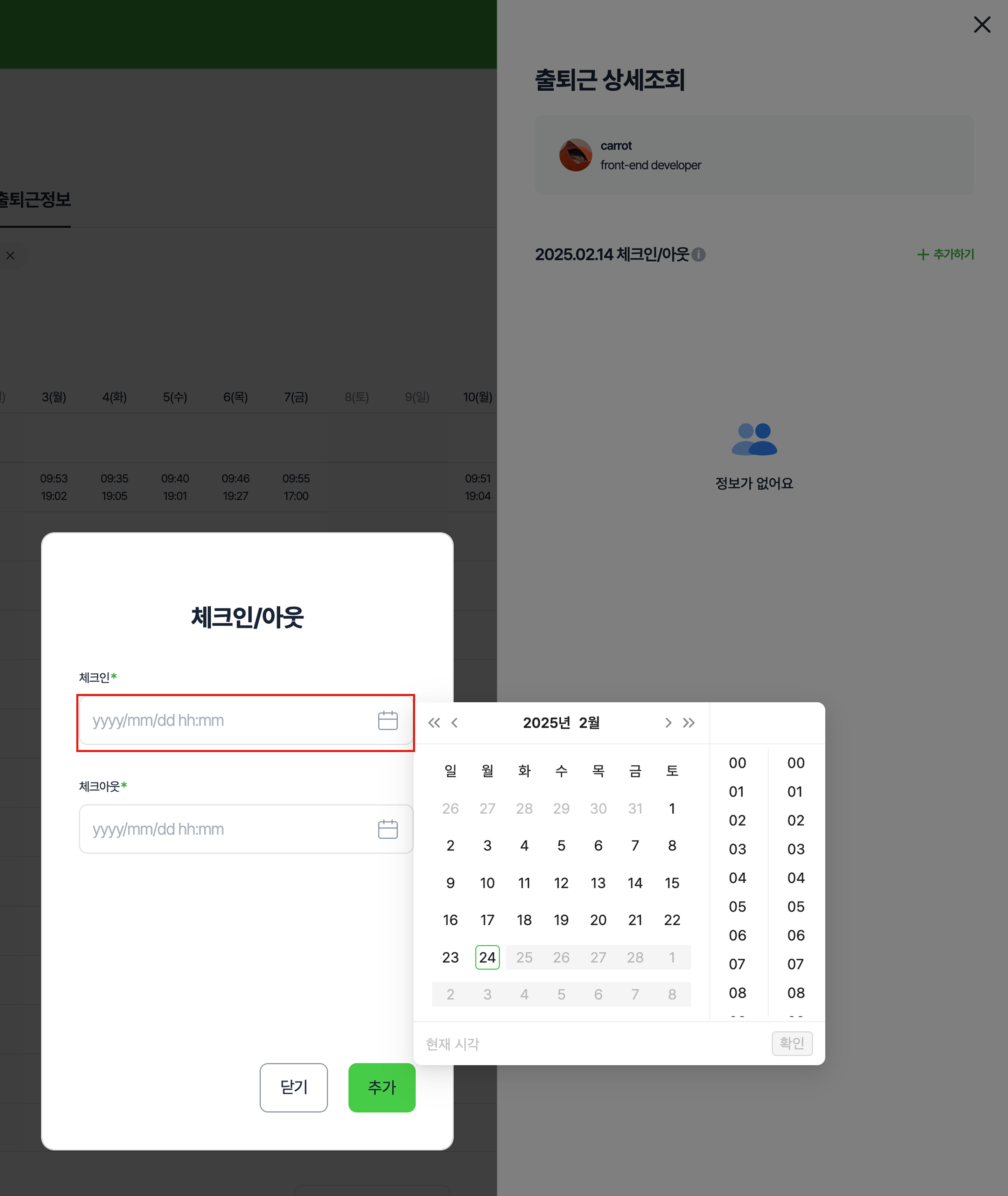 단계 3) [+추가하기] 버튼을 클릭하면 체크인/아웃 시간을 등록할 수 있는 화면이 노출됩니다.