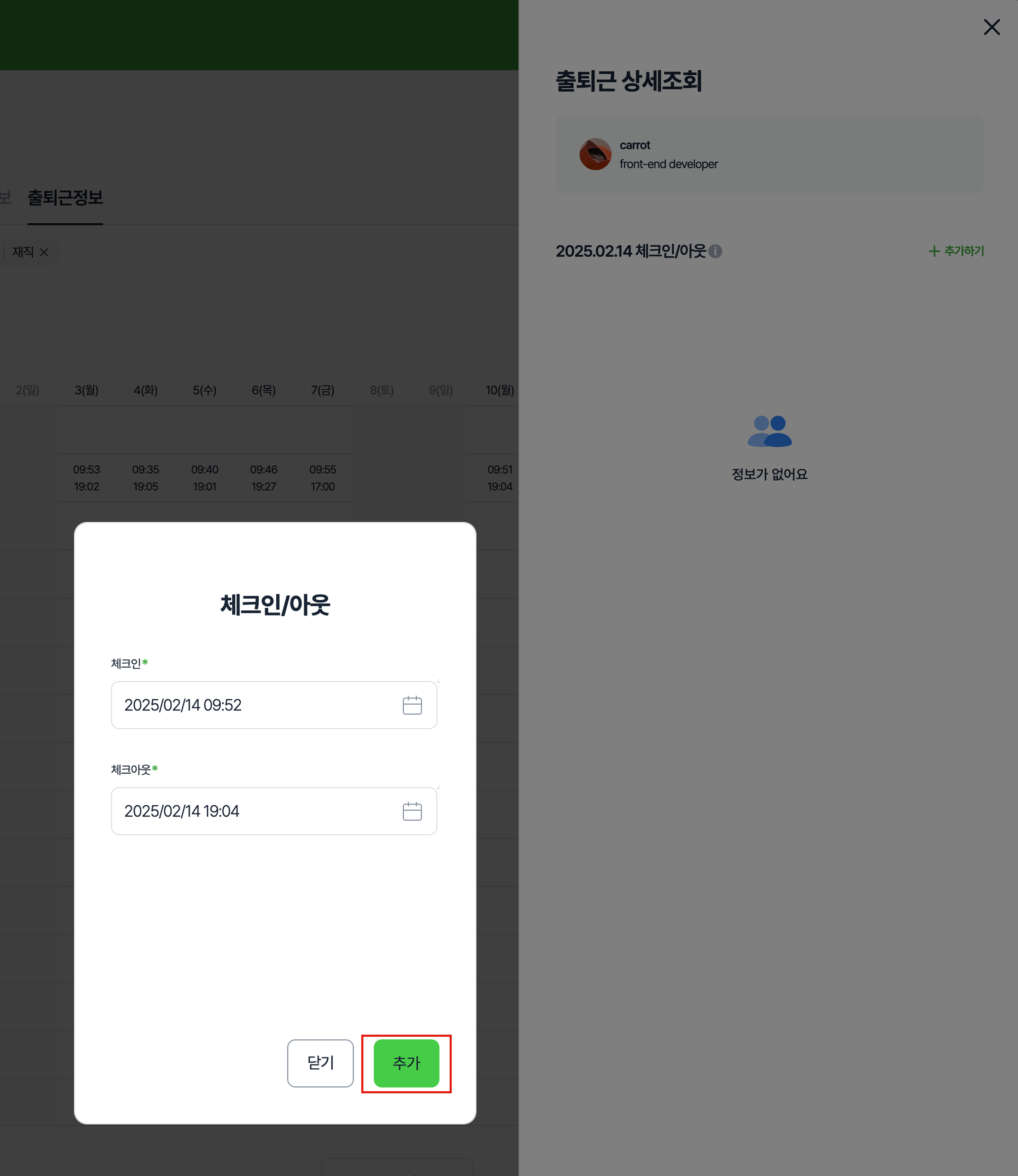 단계 5) [추가] 버튼을 눌러 출퇴근 정보 등록을 완료합니다.