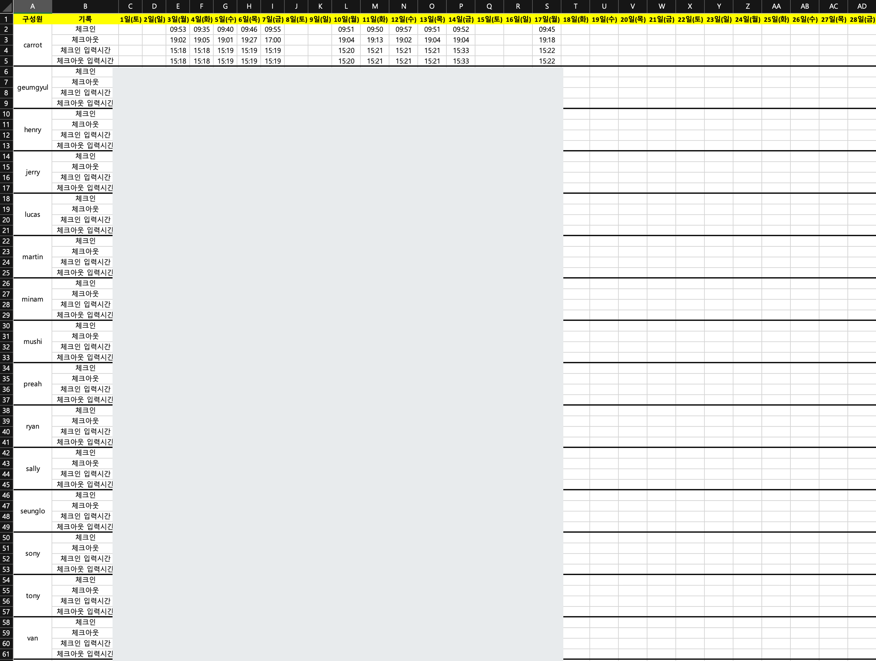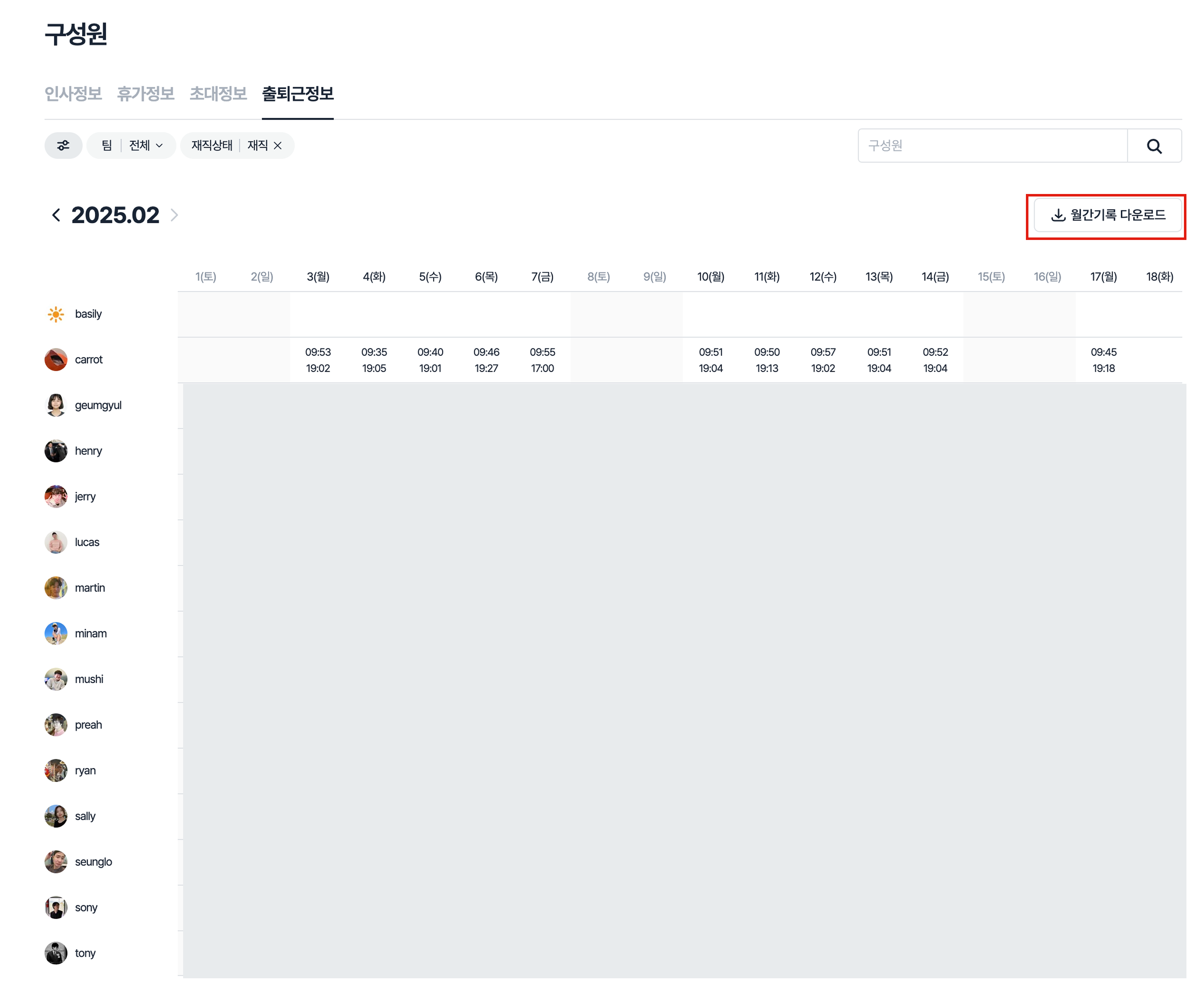 단계 3) 체크인/아웃 시간을 통해 전체 구성원의 월간 출퇴근 시간 정보를 확인할 수 있습니다.