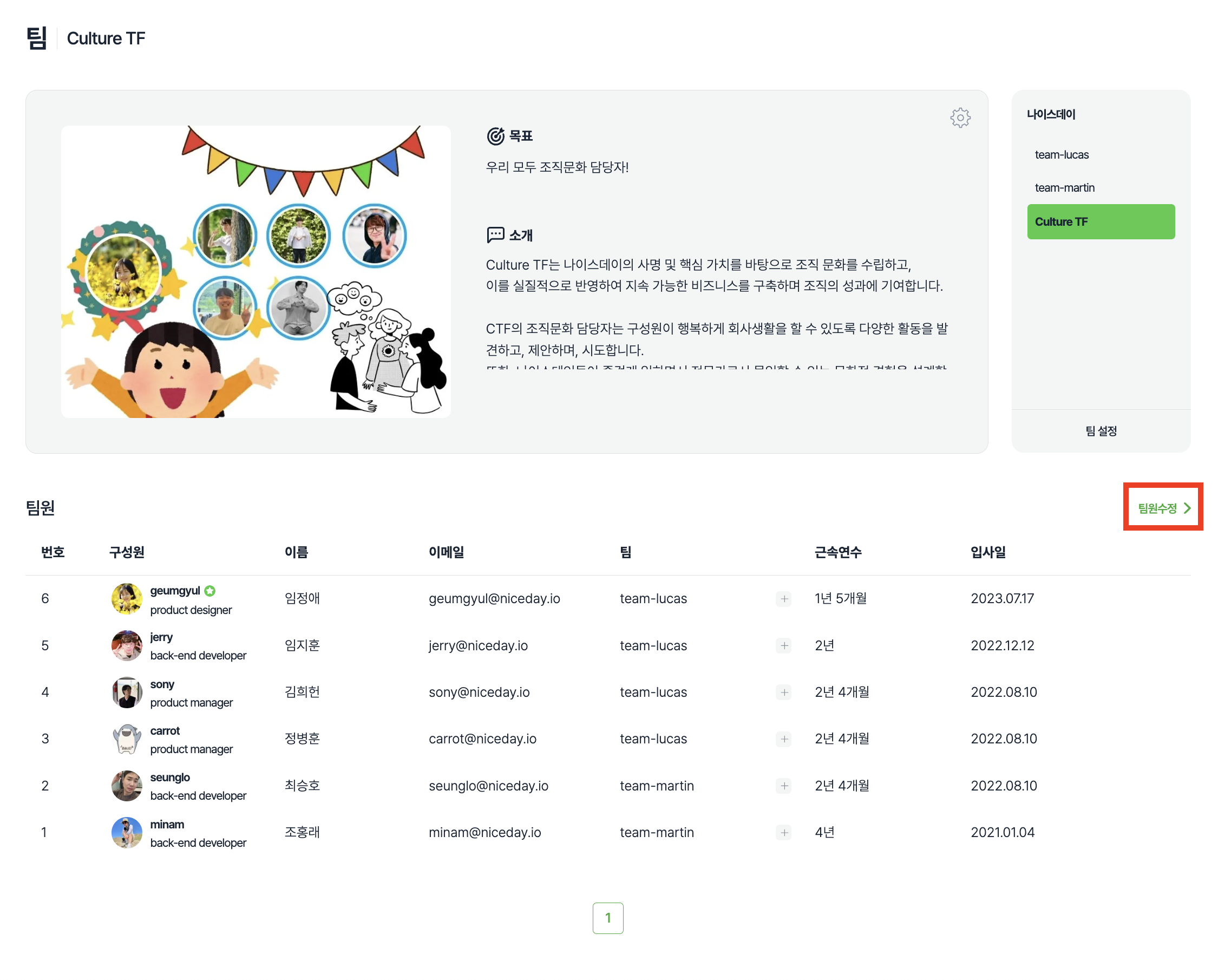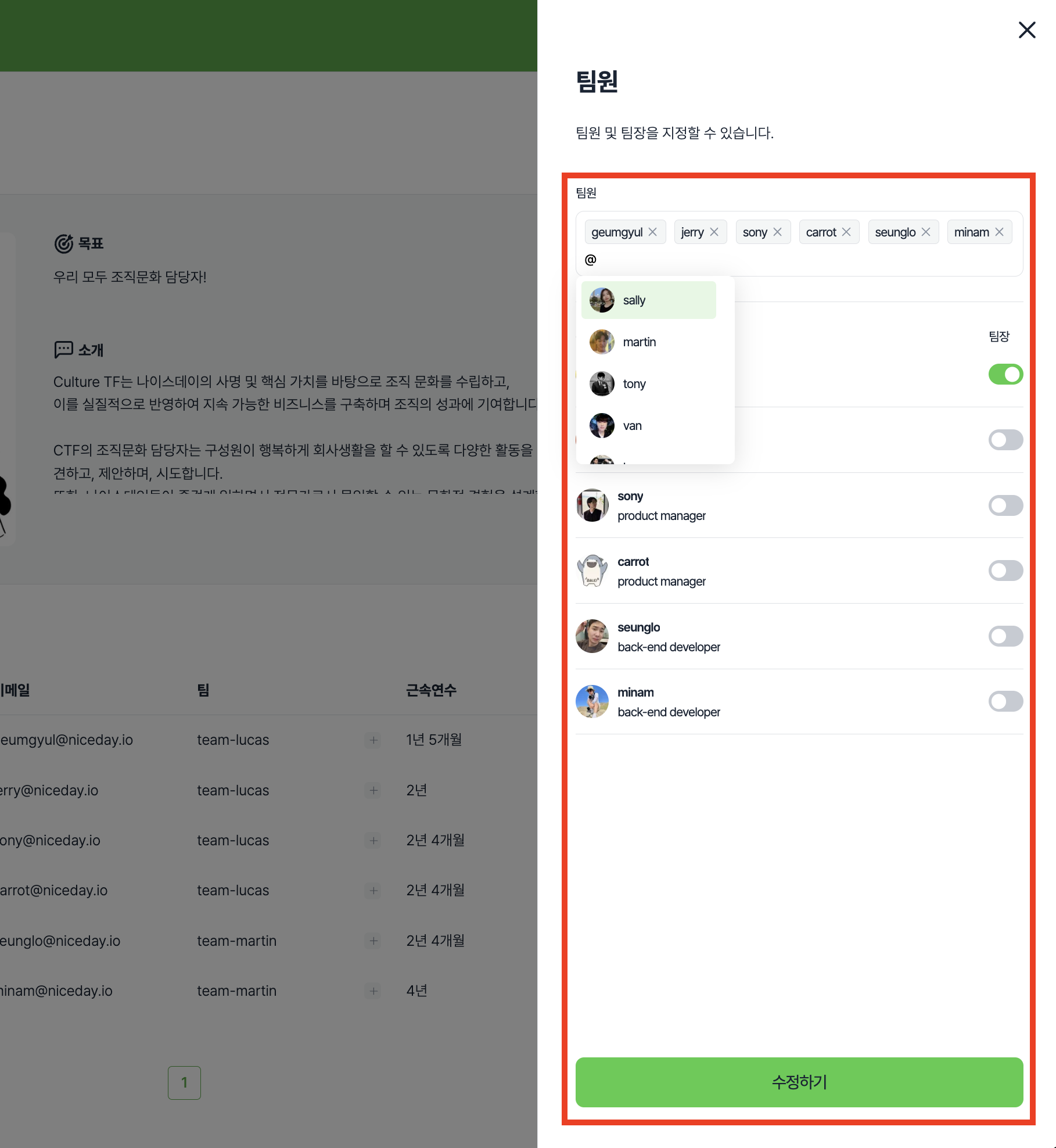 팀 소속 구성원을 변경하거나 팀장을 지정할 수 있습니다.