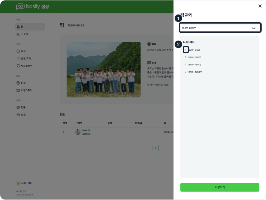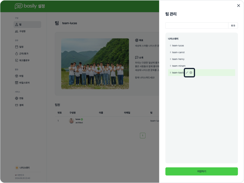 단계 3) [저장하기] 버튼을 눌러 신규 팀 추가를 완료합니다.