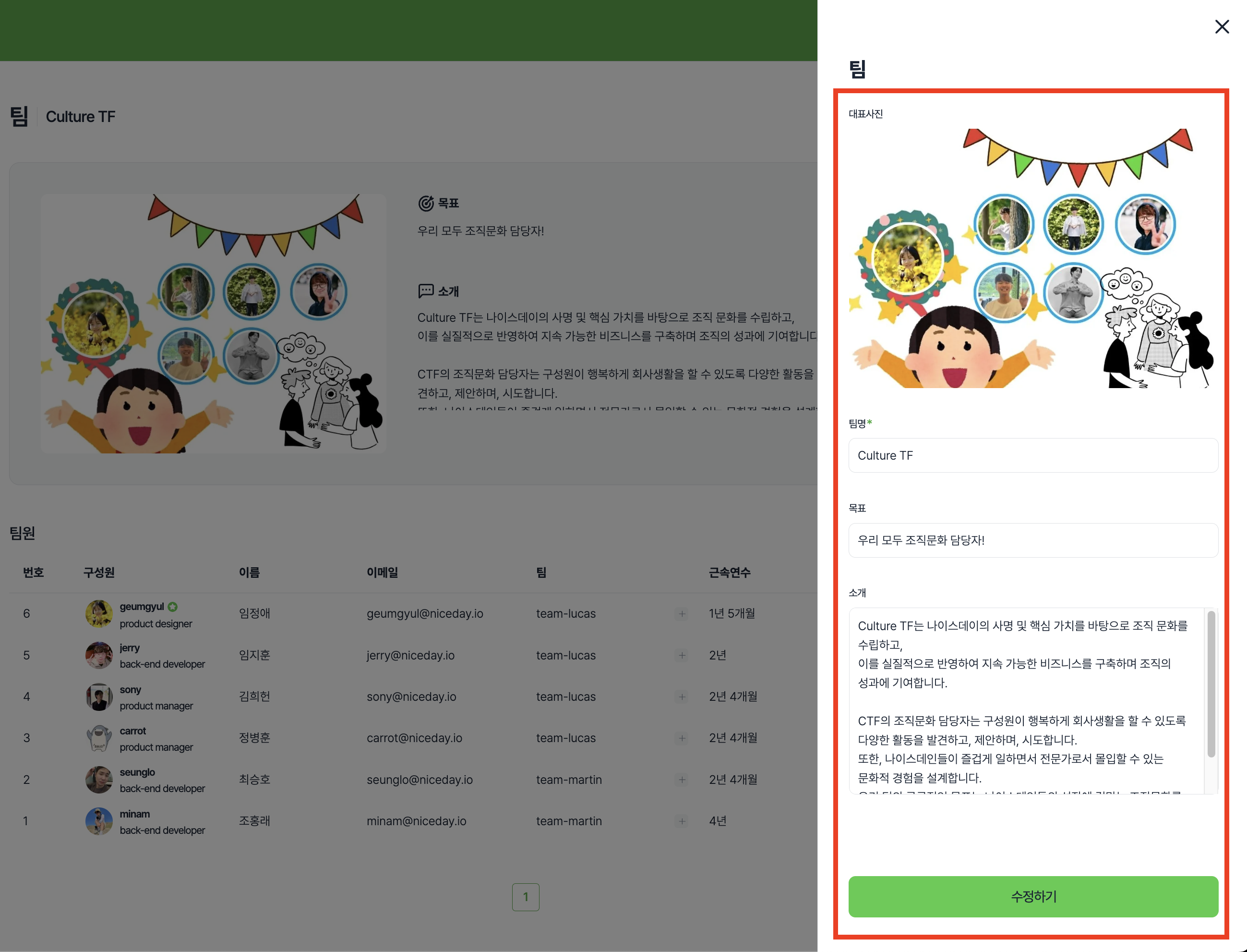 단계 3) 팀 정보를 수정한 후 [수정하기] 버튼을 클릭하면 수정이 완료됩니다.