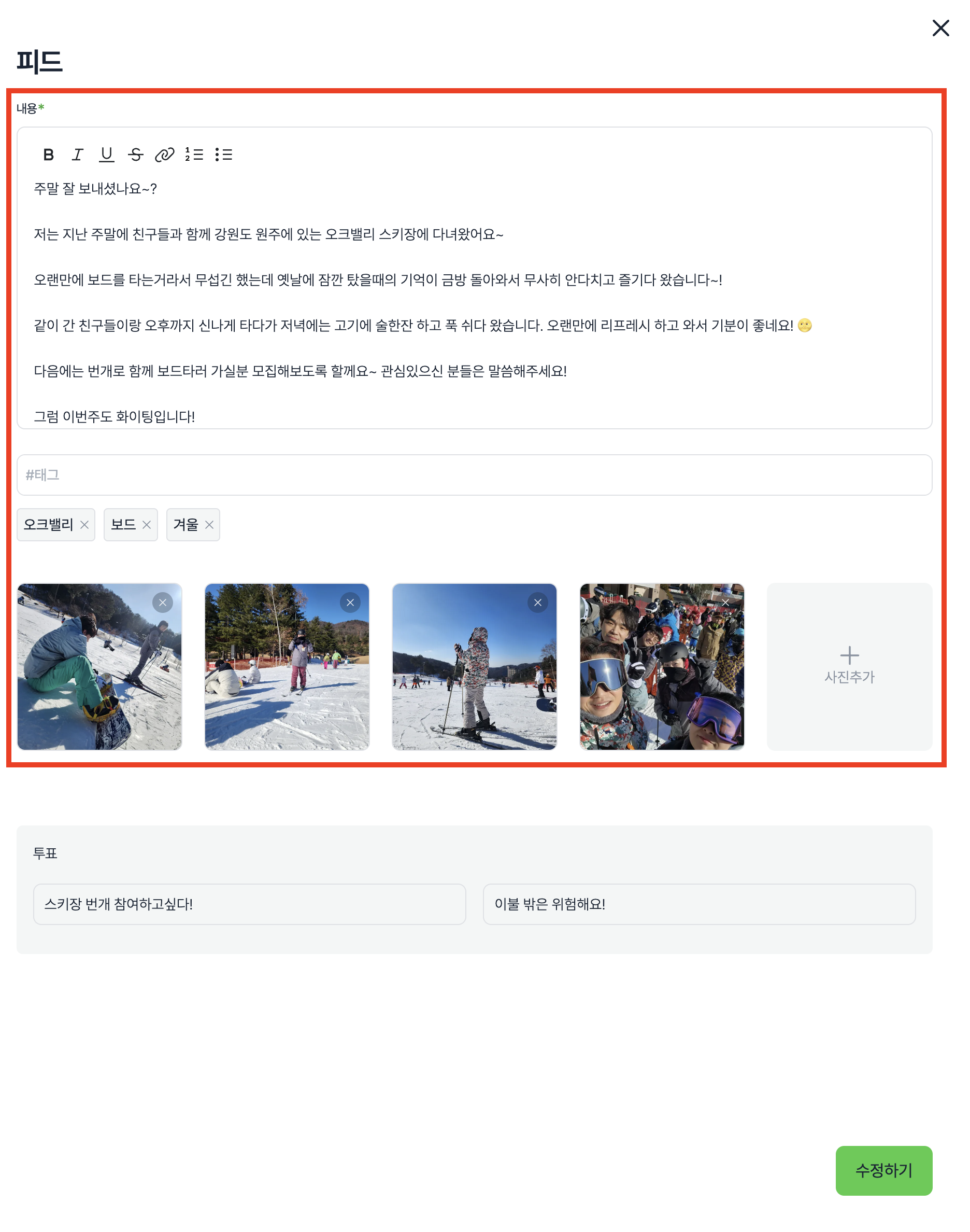 단계 3) [수정하기] 버튼을 클릭하여 피드 수정을 완료합니다.
