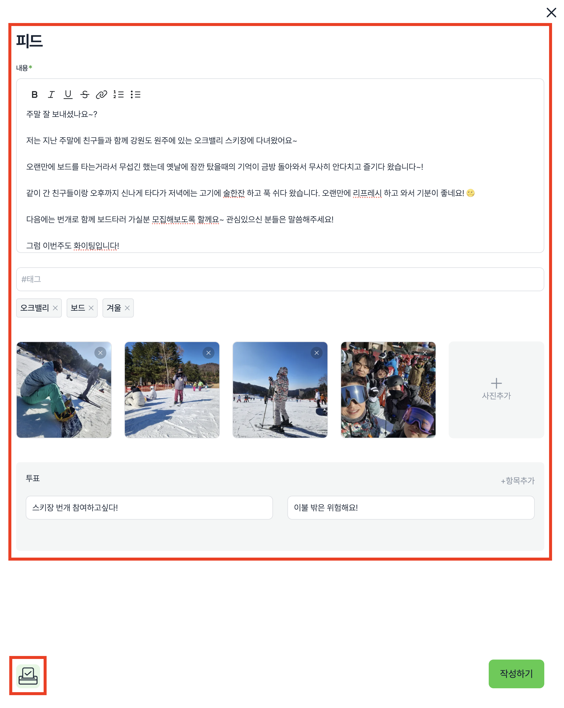 단계 3) [작성하기] 버튼을 클릭하여 피드를 등록합니다.