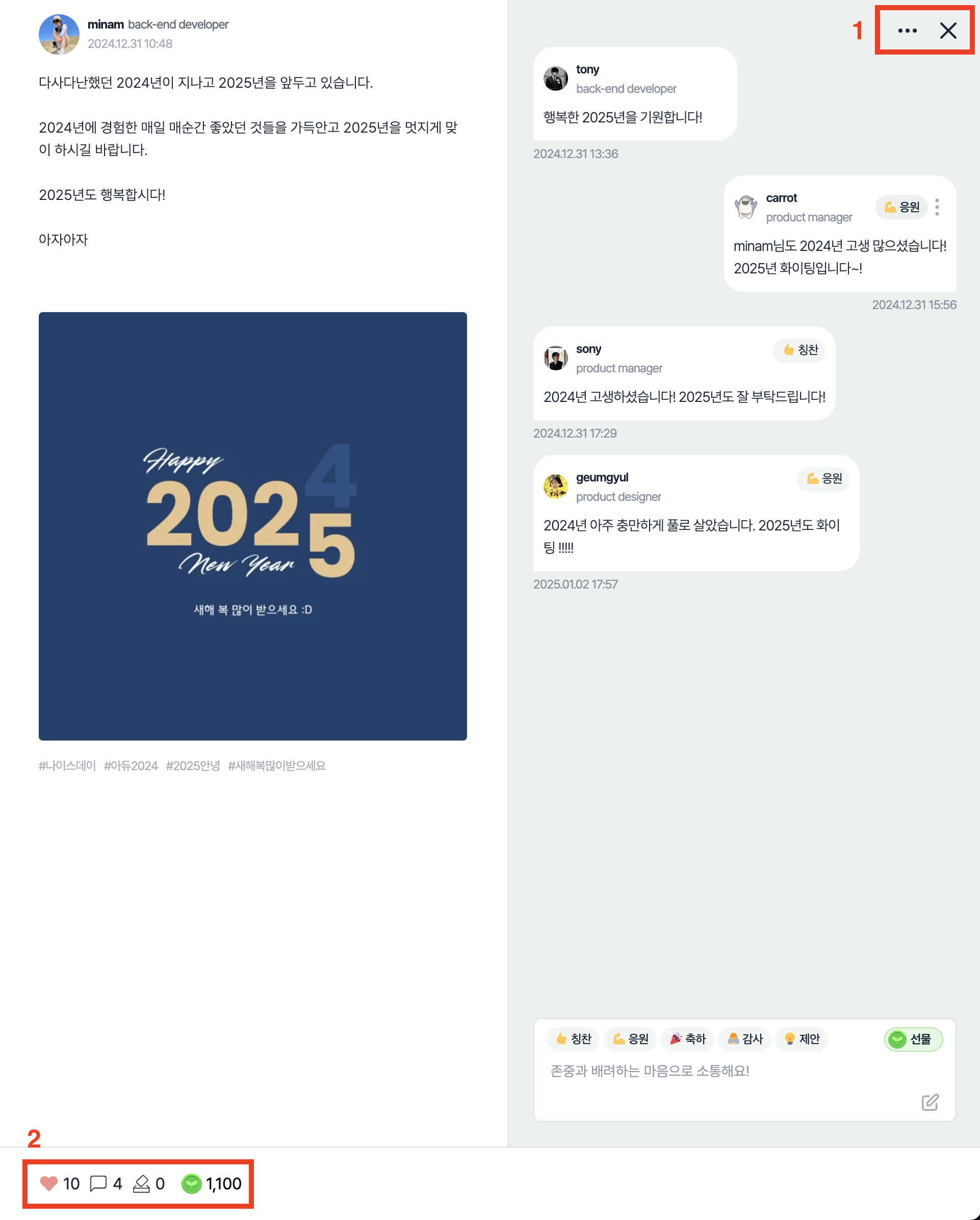 좋아요 : 클릭시 피드에 좋아요를 할 수 있어요. 숫자를 클릭하면 참여한 인원을 확인할 수 있습니다.