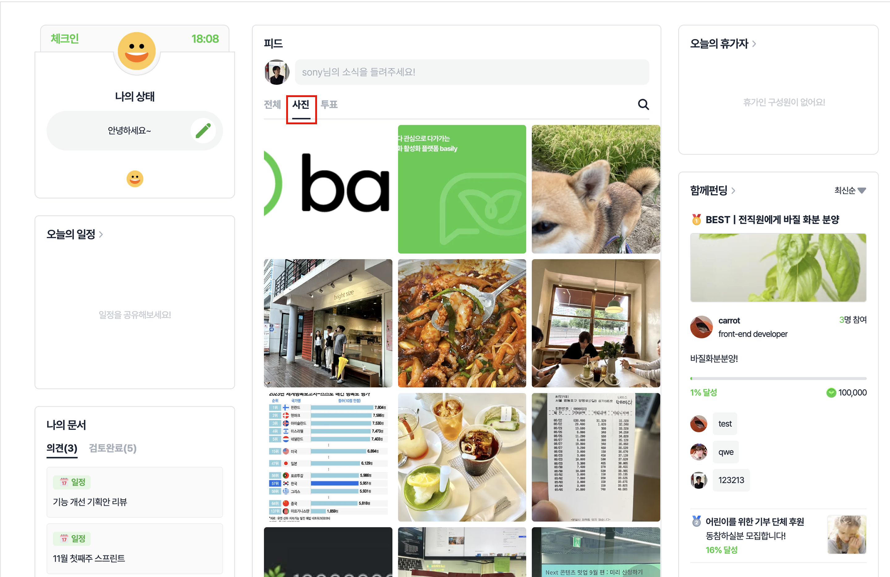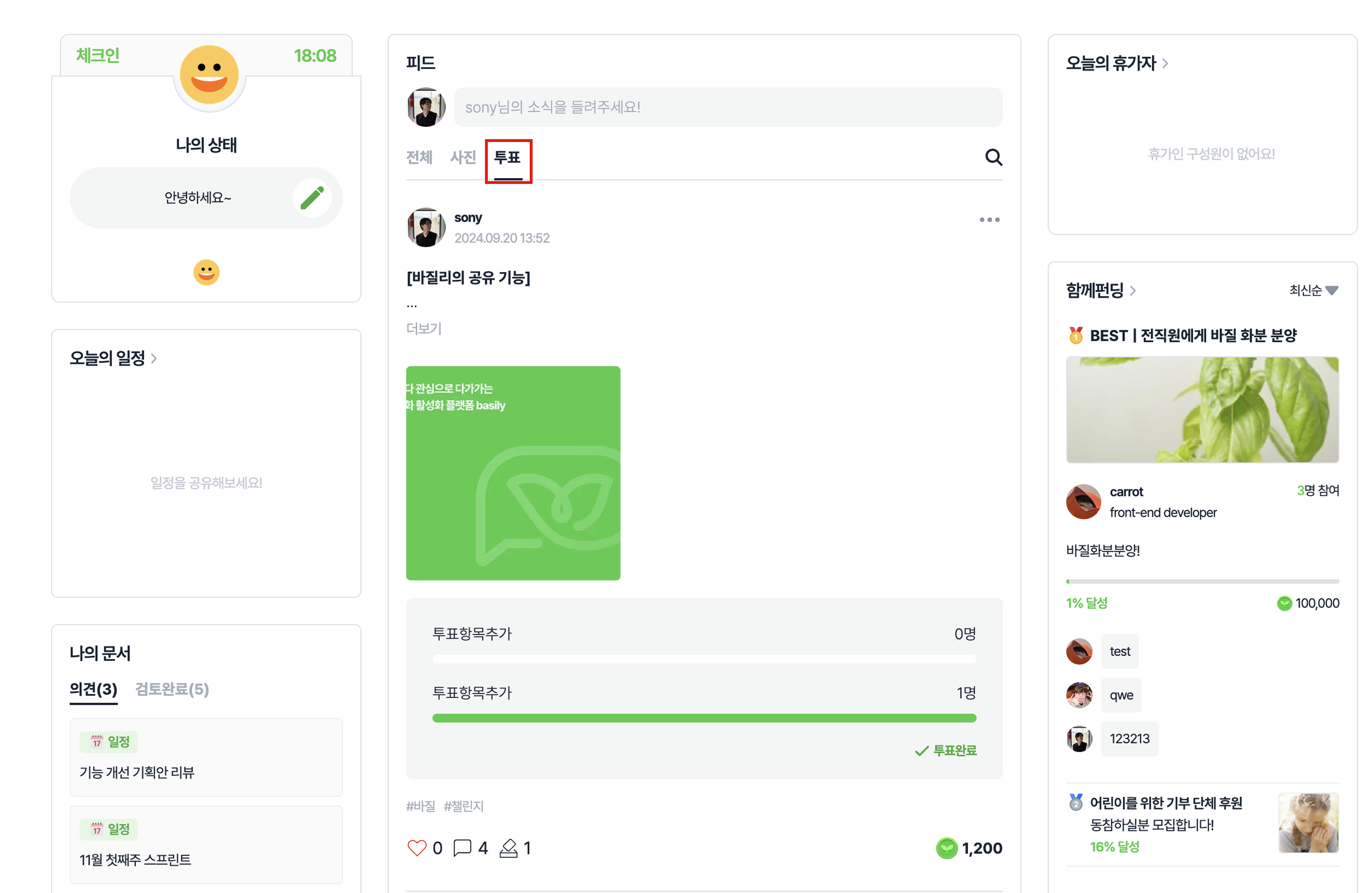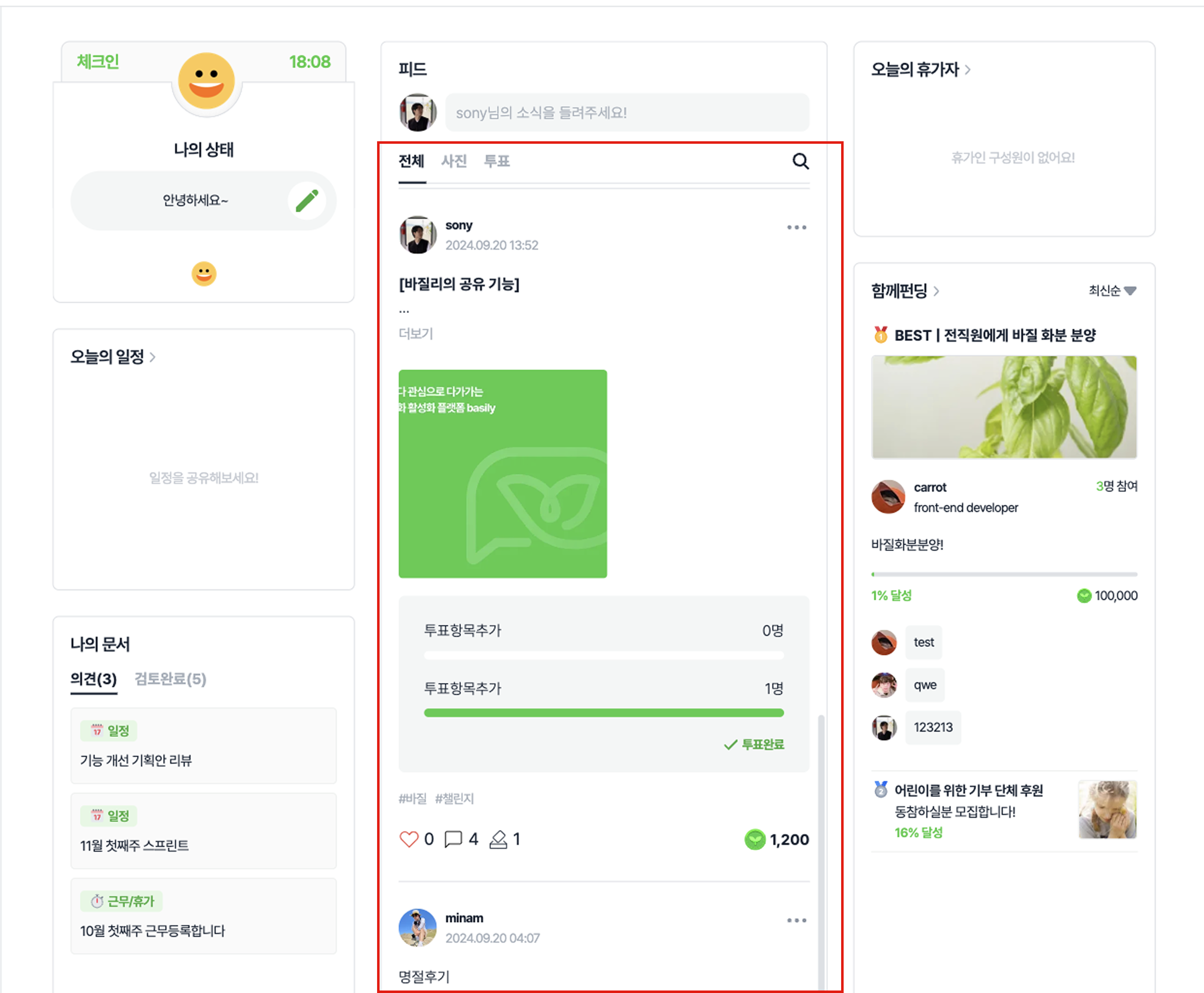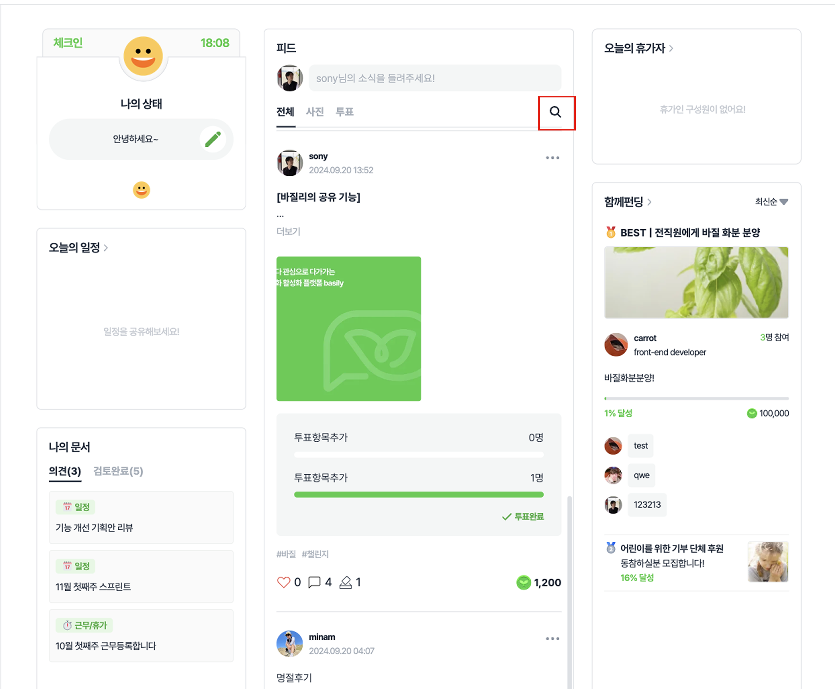 바질 : 피드에서 생성된 바질의 수를 확인할 수 있어요. 클릭하면 바질 생성에 참여한 구성원을 확인할 수 있습니다.