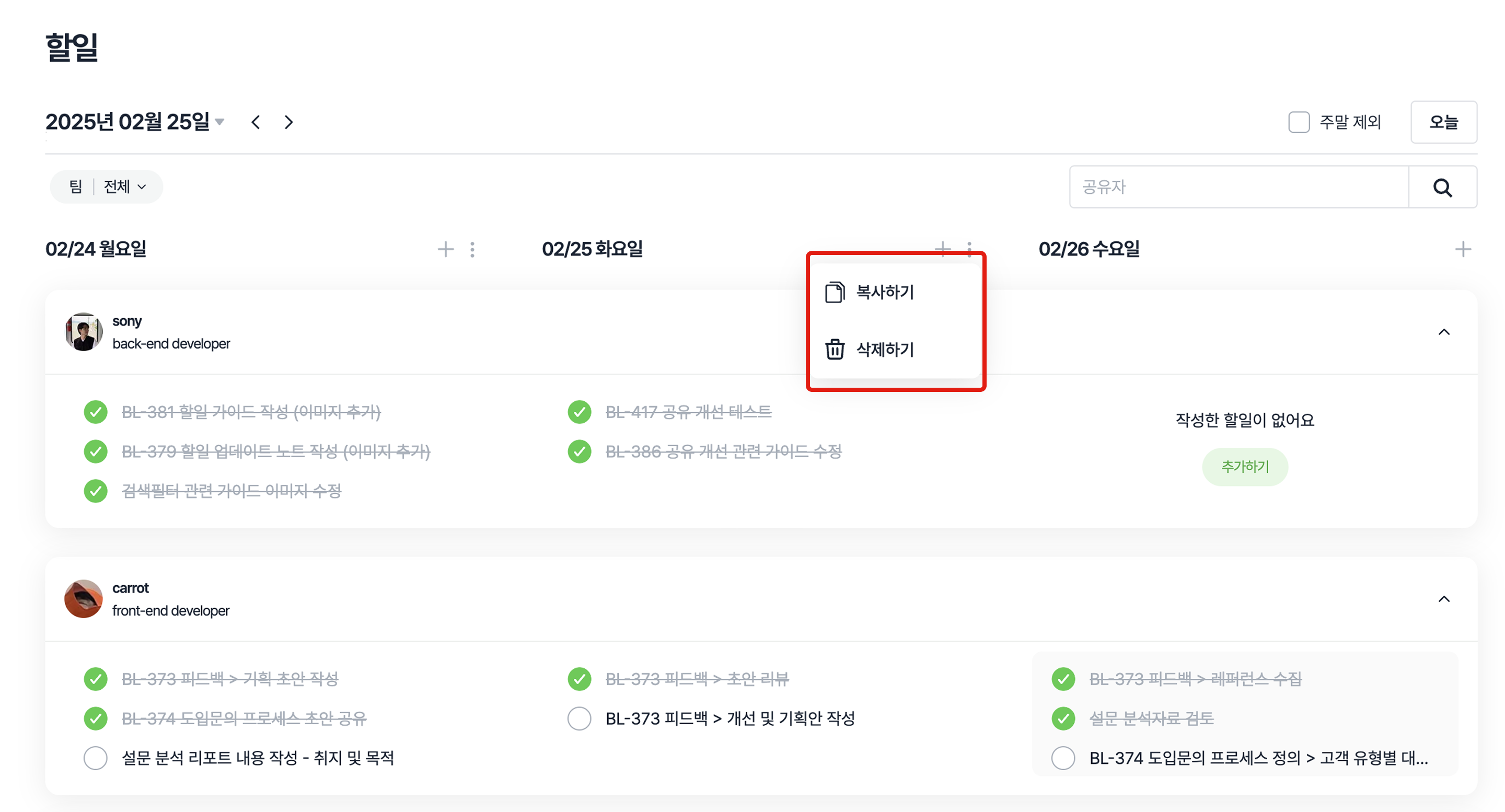 단계 2) [복사하기] 메뉴를 클릭한 후 복사할 날짜를 선택하면 할일 복사가 완료됩니다.