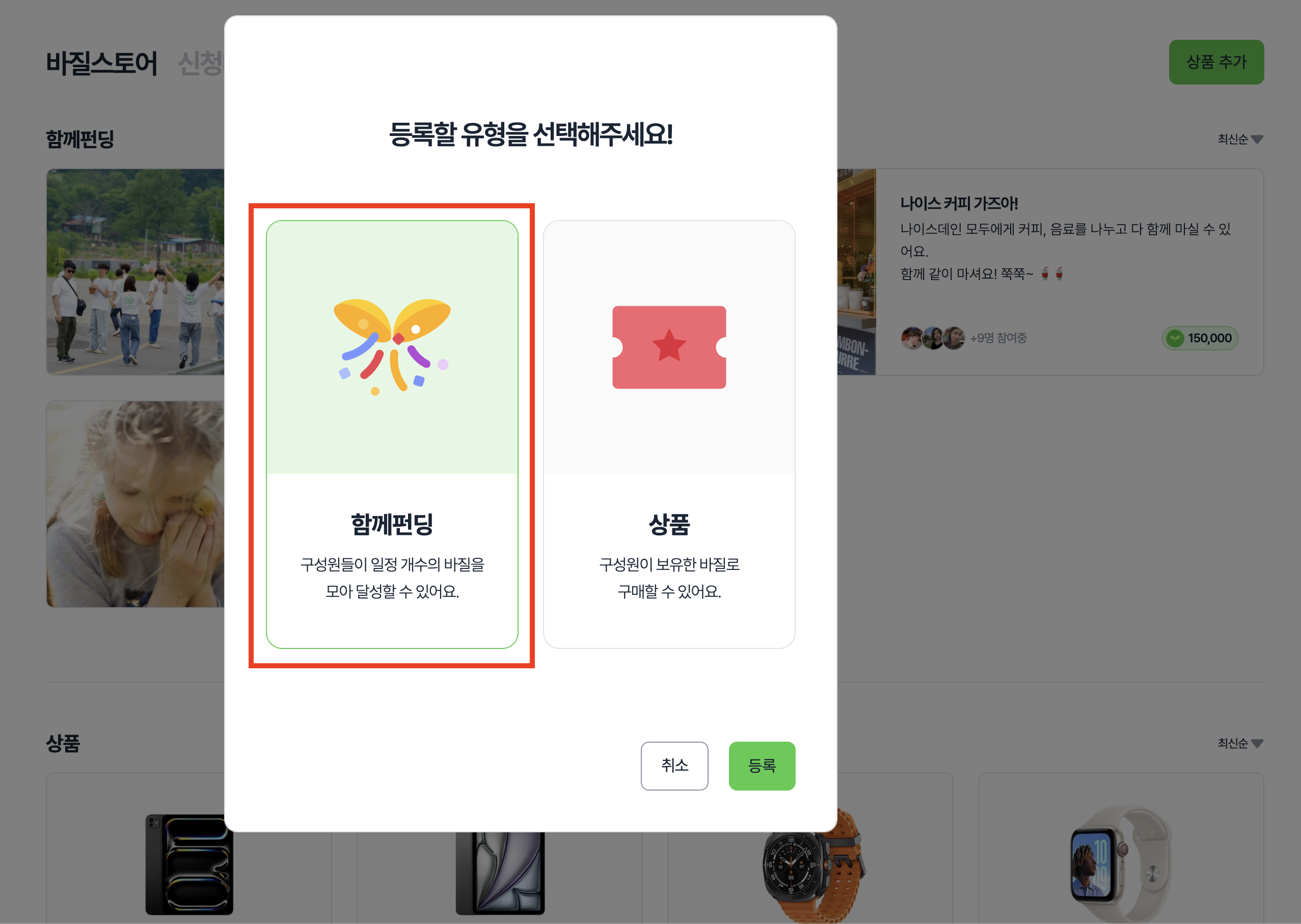 단계 2) 상품 유형 중 [함께펀딩]을 선택 후 [등록] 버튼을 클릭해주세요.